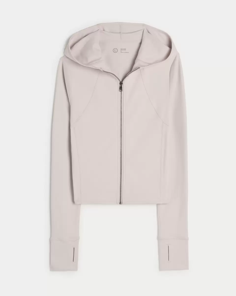 Designed in our breathable, 4-way stretch, moisture-wicking Recharge fabric with a super soft, brushed feel. Zip-up closure, front pockets, long sleeves with thumb openings, cropped length, hood. Imported.