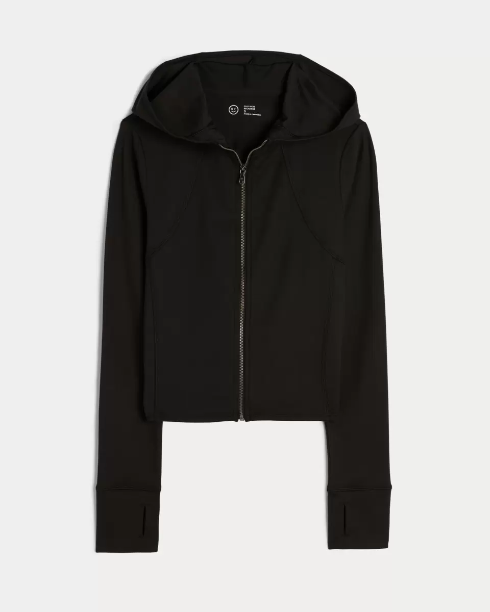 Designed in our breathable, 4-way stretch, moisture-wicking Recharge fabric with a super soft, brushed feel. Zip-up closure, front pockets, long sleeves with thumb openings, cropped length, hood. Imported.