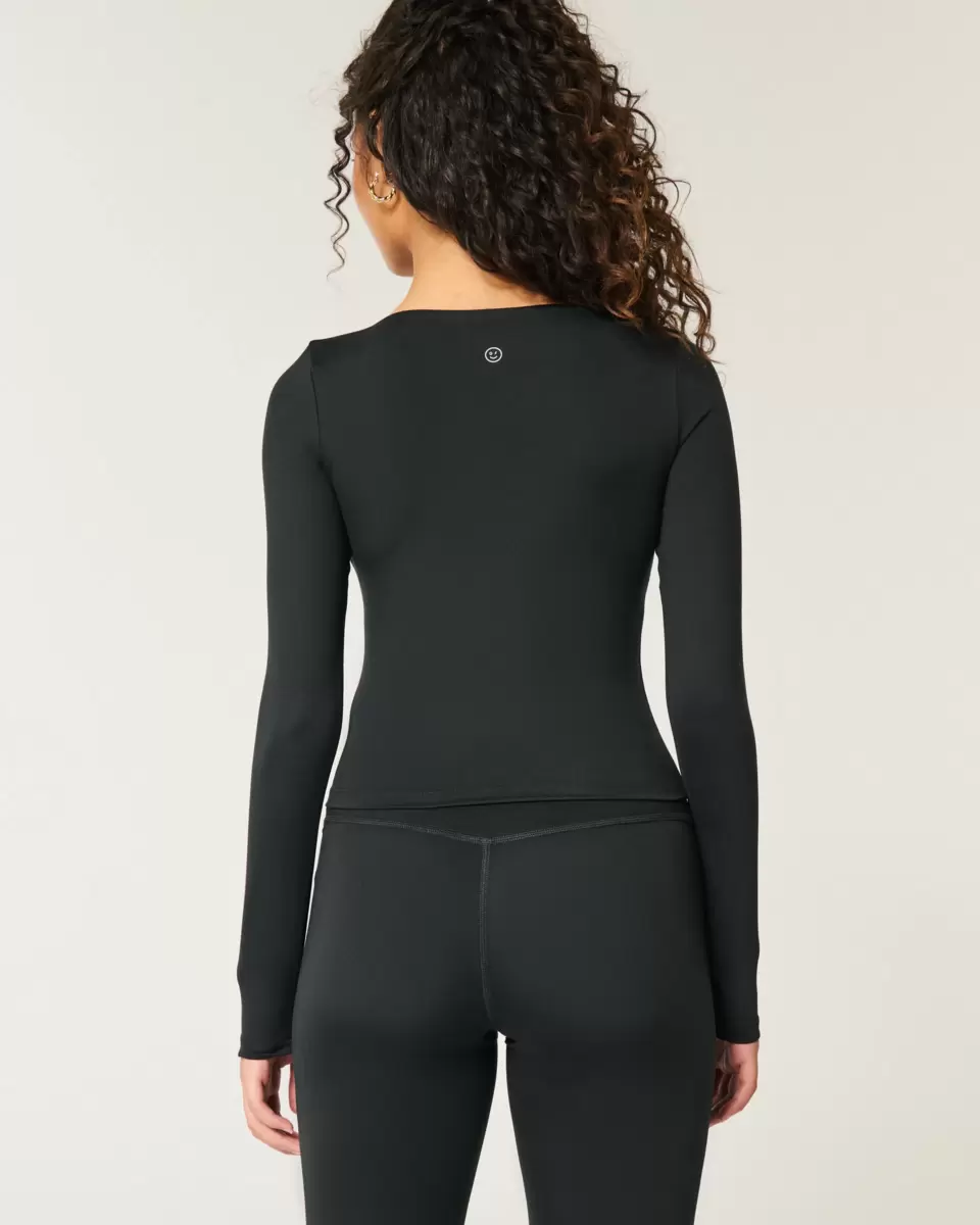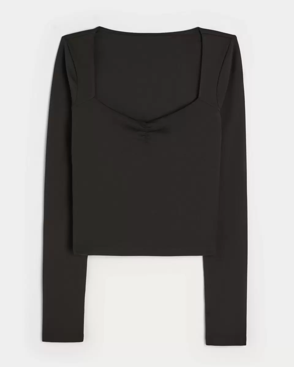 This super cute top is designed in our breathable, 4-way stretch, moisture-wicking Recharge fabric with a super soft, brushed feel. Sweetheart neckline with ruched detail, long sleeves, built-in shelf bra with removable pads. Long sleeves, thumb openings. Imported.