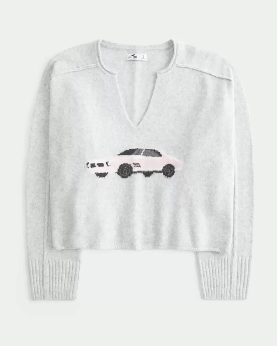 Super soft and comfy, this sweater features a car intarsia graphic. Notch neckline, long sleeves with ribbed hems.