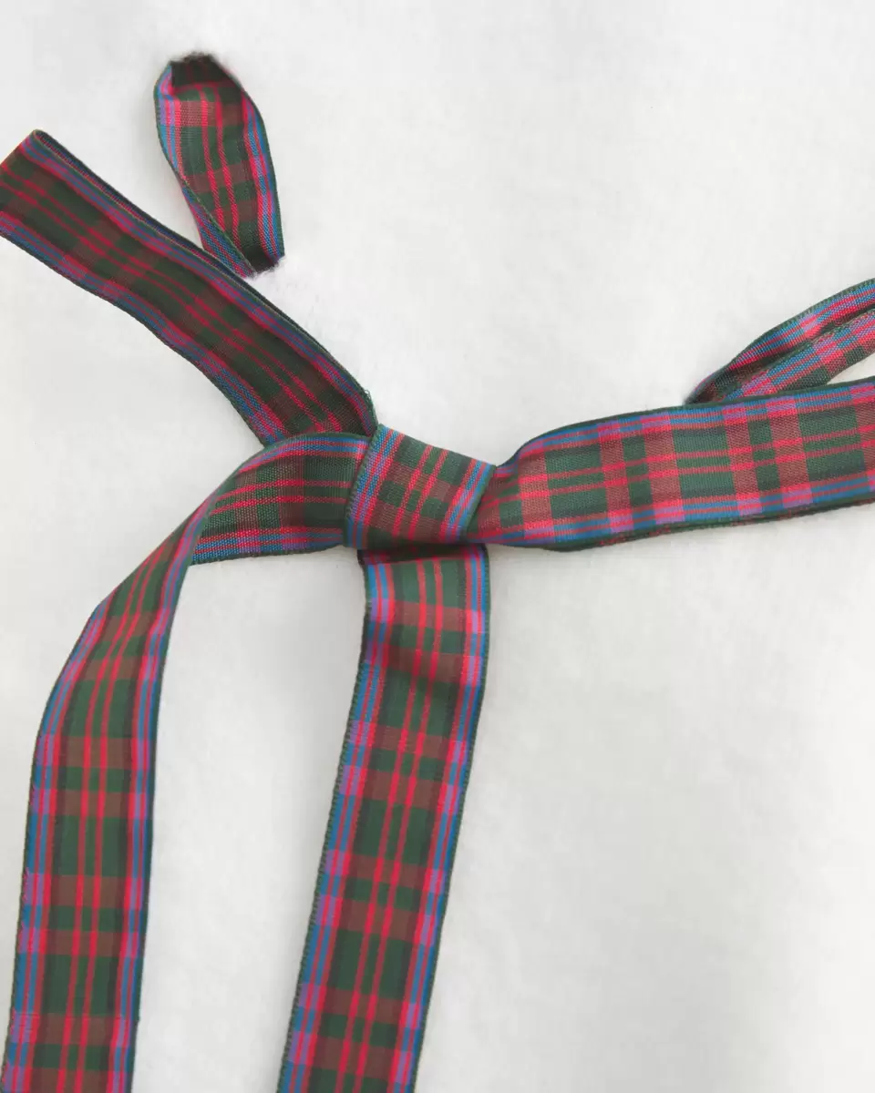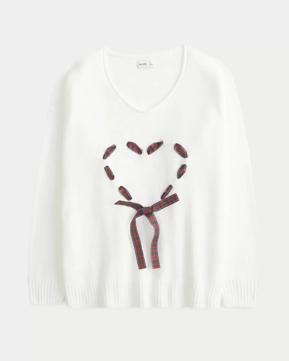 Made with cozy and super soft yarns, this sweater features a heart-shaped bow and v-neckline. Ribbed trims, long sleeves. Oversized Fit. Imported.