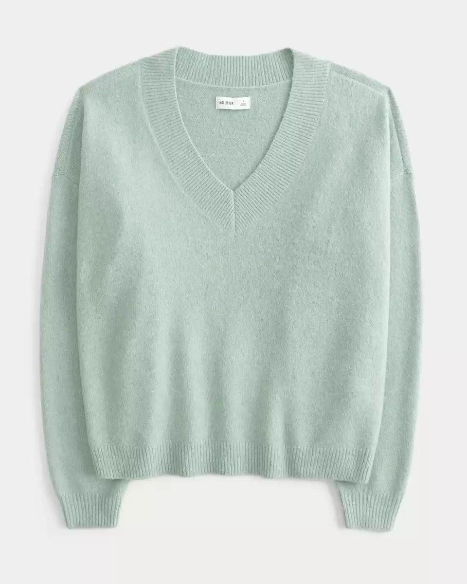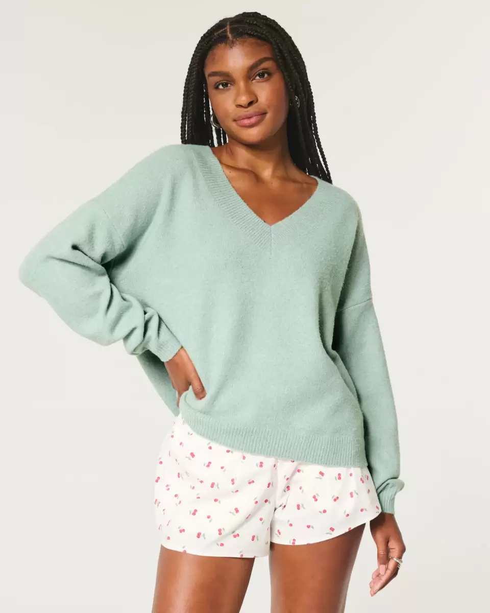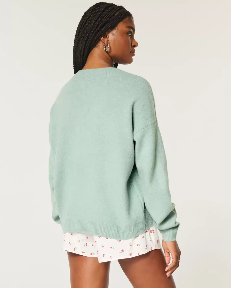 Cute and super soft, this sweater features a v-neckline and long sleeves. Ribbed trims. Oversized Fit.