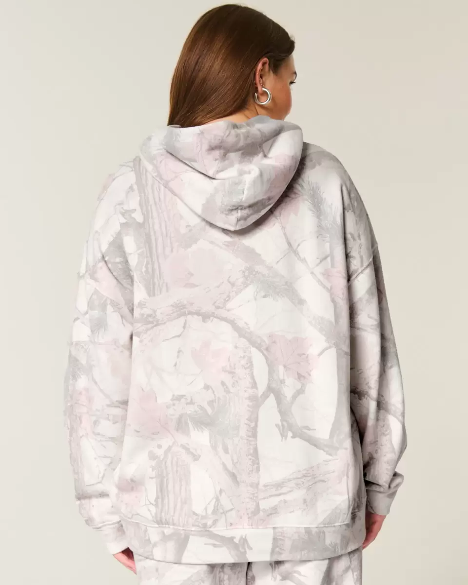 A cute and cozy hoodie in super soft fleece fabric. Hood, front pouch pocket, long sleeves, all-over camo pattern. Oversized Fit. Imported.