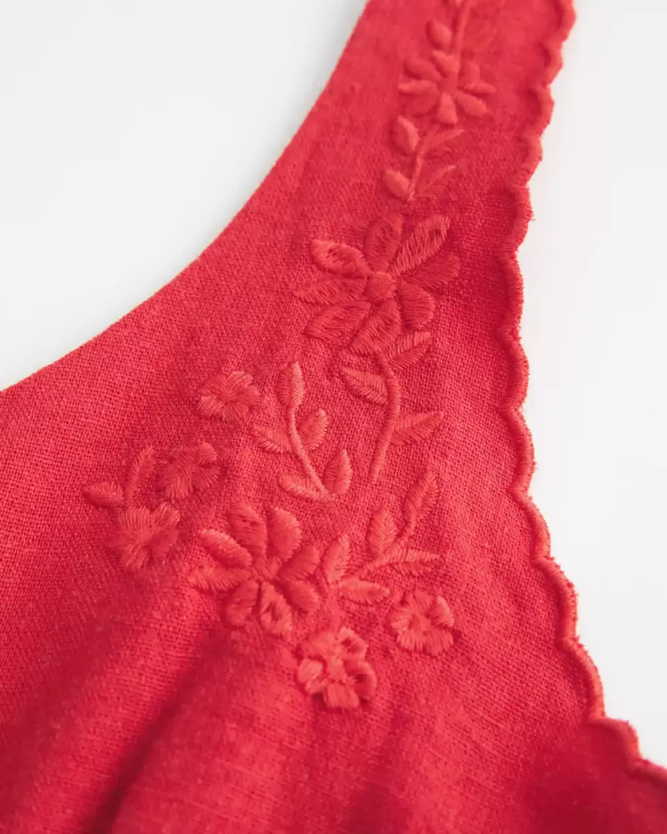 This pretty blouse features pretty embroidered detailing and scalloped trim along the straps, a scoop neckline and button-through closure. Soft smocked back. Slim Fit. Imported.