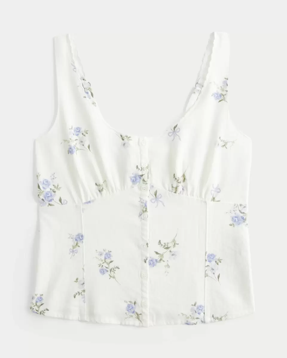 This pretty blouse features pretty embroidered detailing and scalloped trim along the straps, a scoop neckline and button-through closure. Soft smocked back. Slim Fit. Imported.