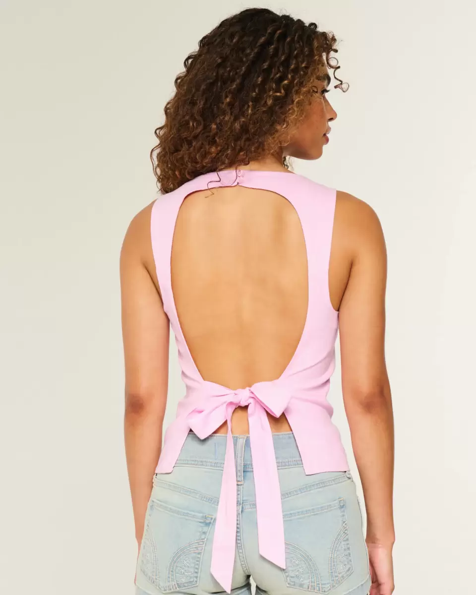 A super cute top in a soft linen blend, designed with an open back and high neckline. Back tie closure, seam details. Slim Fit. Imported.