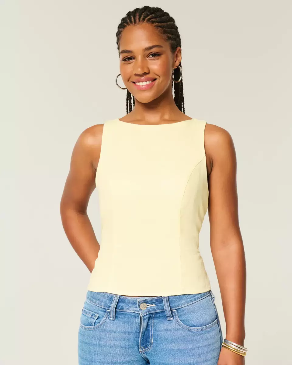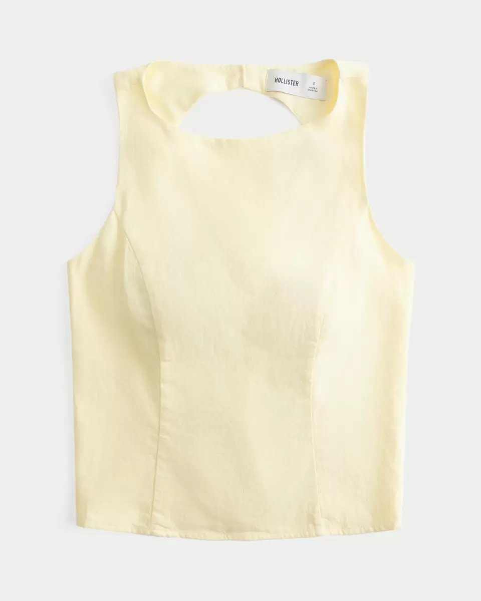 A super cute top in a soft linen blend, designed with an open back and high neckline. Back tie closure, seam details. Slim Fit. Imported.