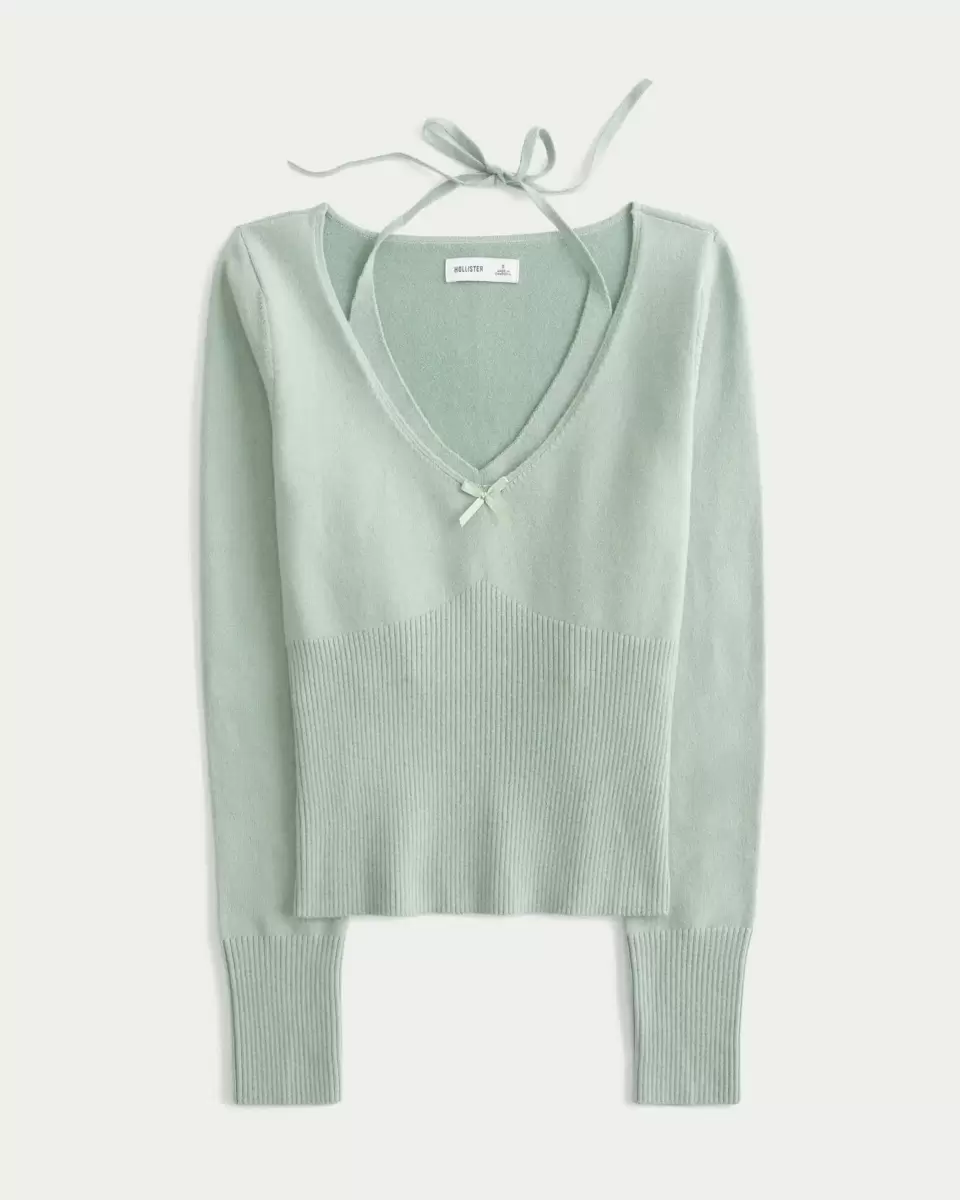 This super soft sweater features a v-neckline with a slim halter tie underneath for a layered look. Long sleeves, ribbed trims, v-neckline with cute bow detail. Slim Fit. Imported.