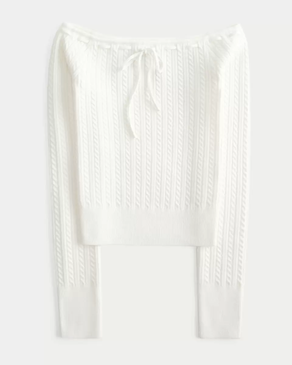 Cute and cozy, this super soft sweater features cable-knit patterns and an off-the-shoulder neckline with passementerie detail. Long sleeves, ribbed trims. Slim Fit.