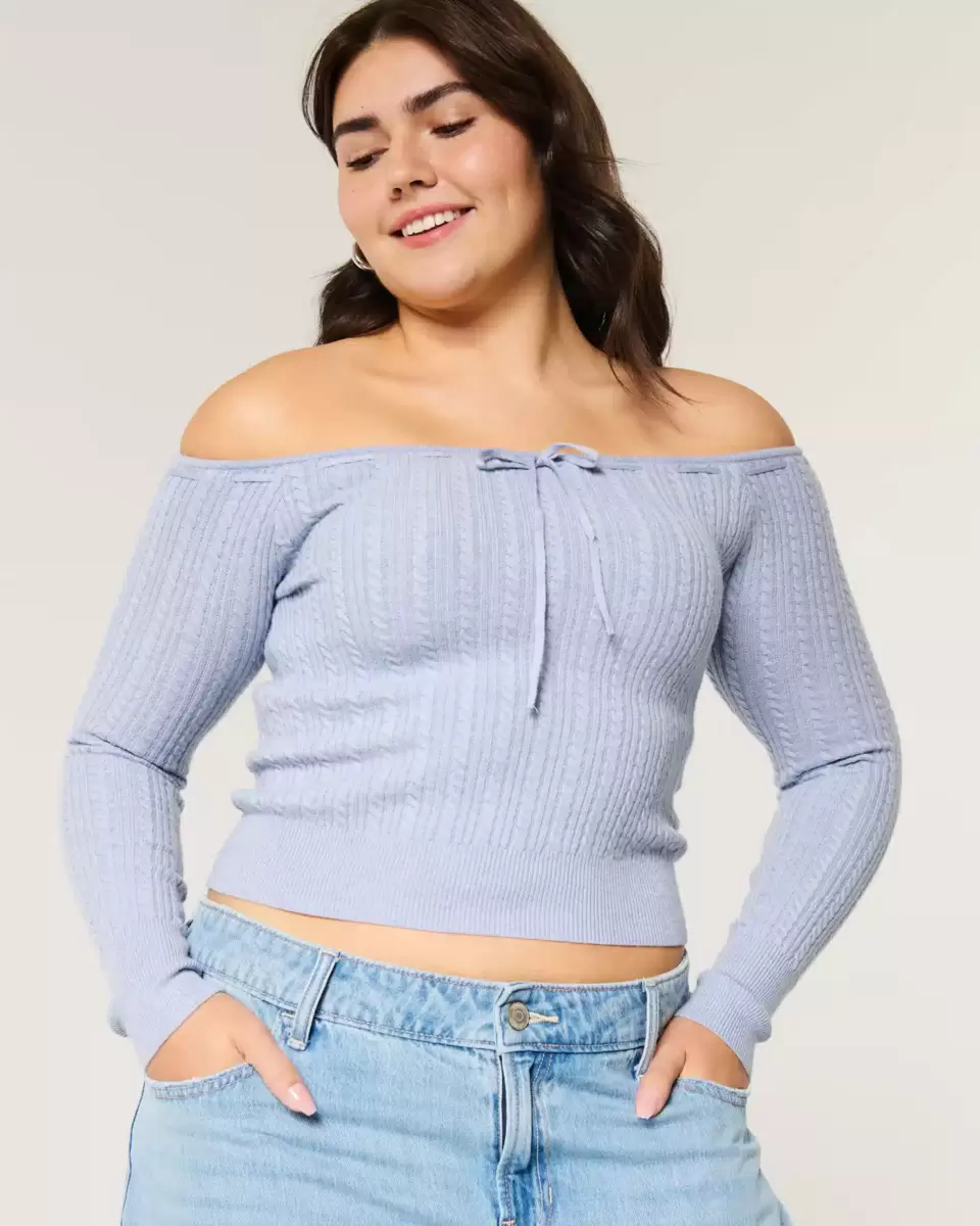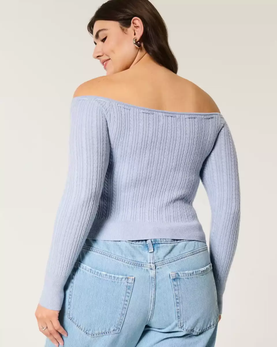 Cute and cozy, this super soft sweater features cable-knit patterns and an off-the-shoulder neckline with passementerie detail. Long sleeves, ribbed trims. Slim Fit. Imported.
