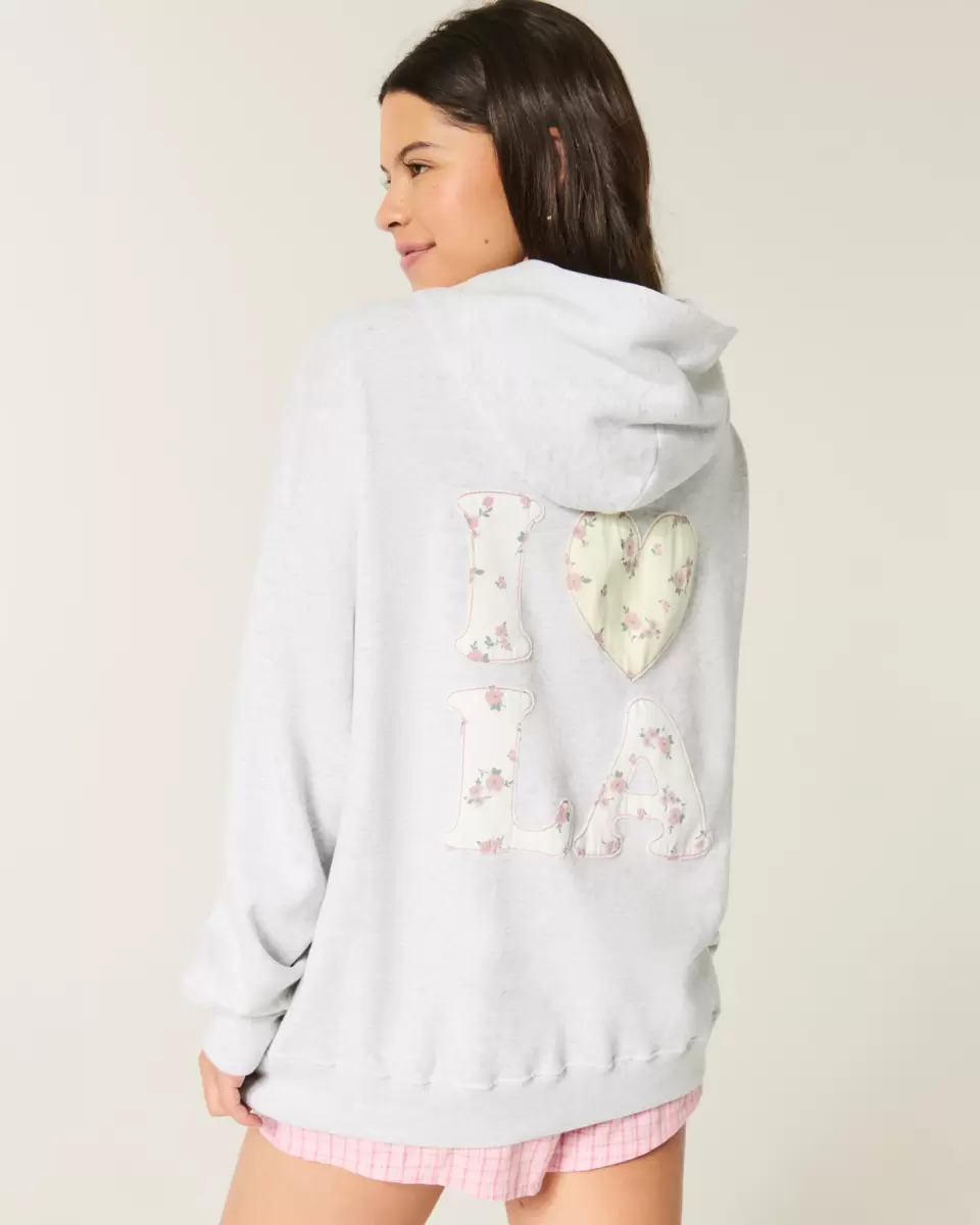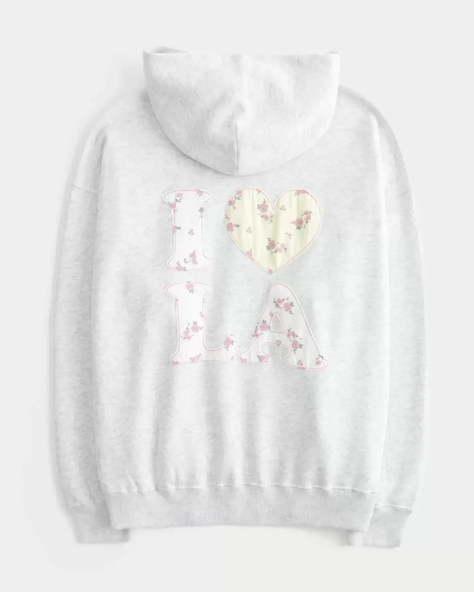 A super soft fleece hoodie featuring I Heart LA graphic applique at the back and an embroidered heart detail at the left chest. Hood, long sleeves, front pouch pocket. Oversized Fit. Imported.