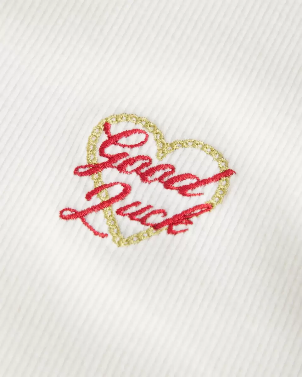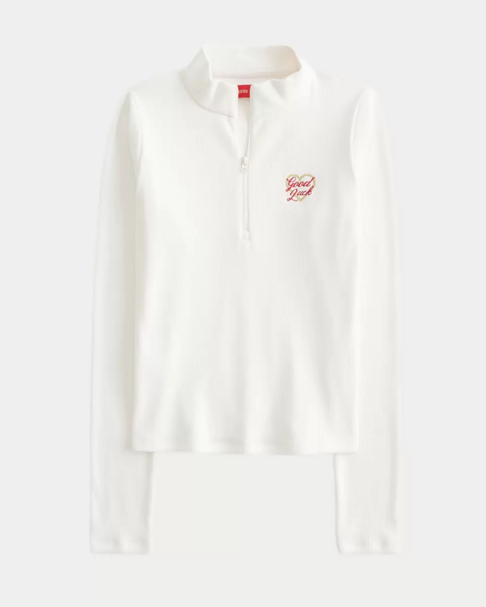 Made with super soft and comfy ribbed fabric, this long-sleeve top features a half-zip closure, mock neckline and embroidered Lunar New Year-inspired Good Luck graphic at the left chest. Imported.