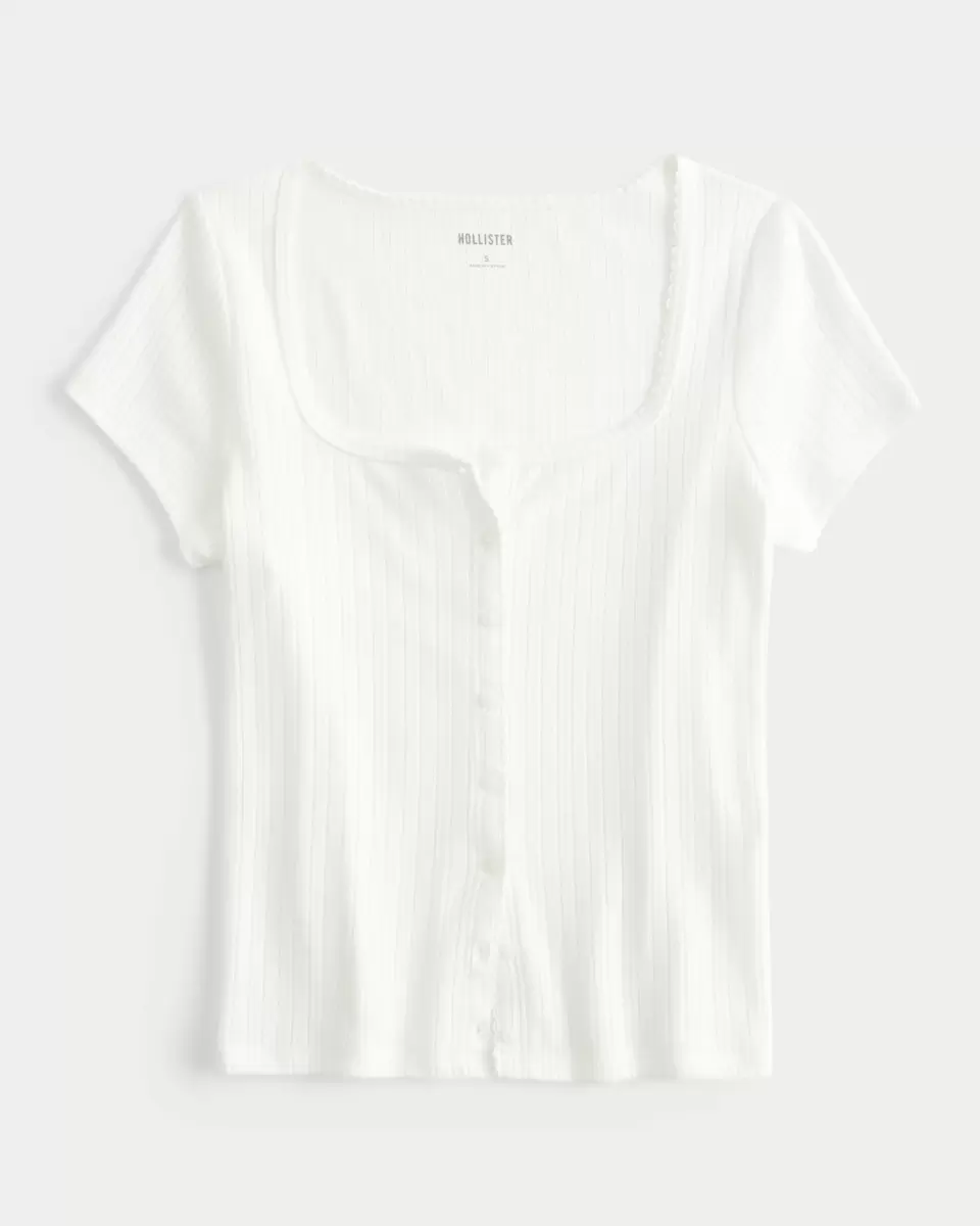 This cute and comfy top is made with super soft pointelle fabric. Button-through closure, short sleeves, square neckline. Slim Fit. Imported.
