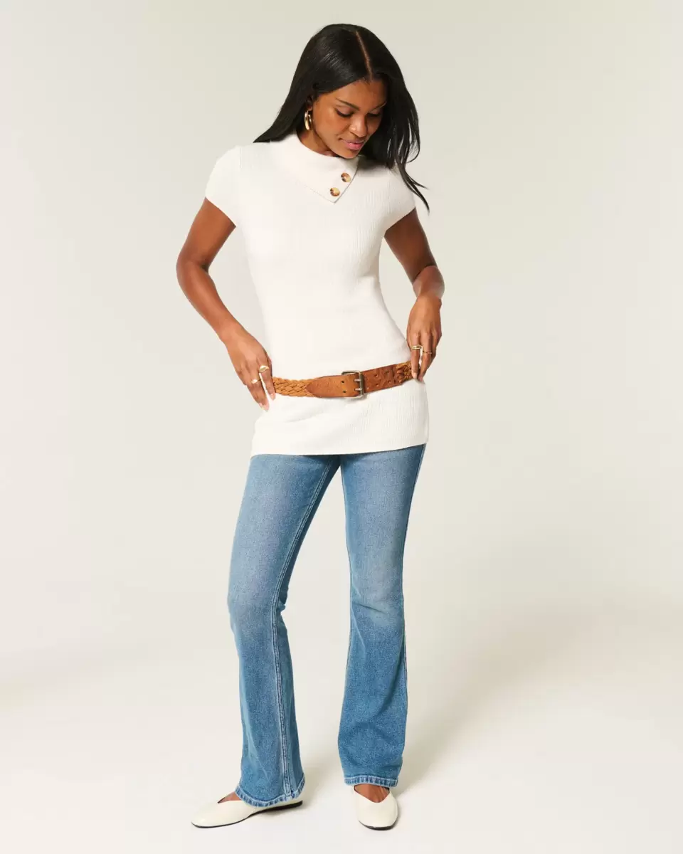 A cozy and super soft sweater designed with a classic tunic silhouette. Foldover neckline with button details, short sleeves. Slim Fit. Imported.