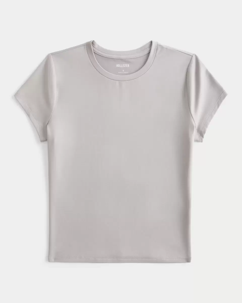 This cute and comfy baby tee is made with soft stretch fabric with a seamless look and feel. Longline silhouette, crew neckline, short sleeves.