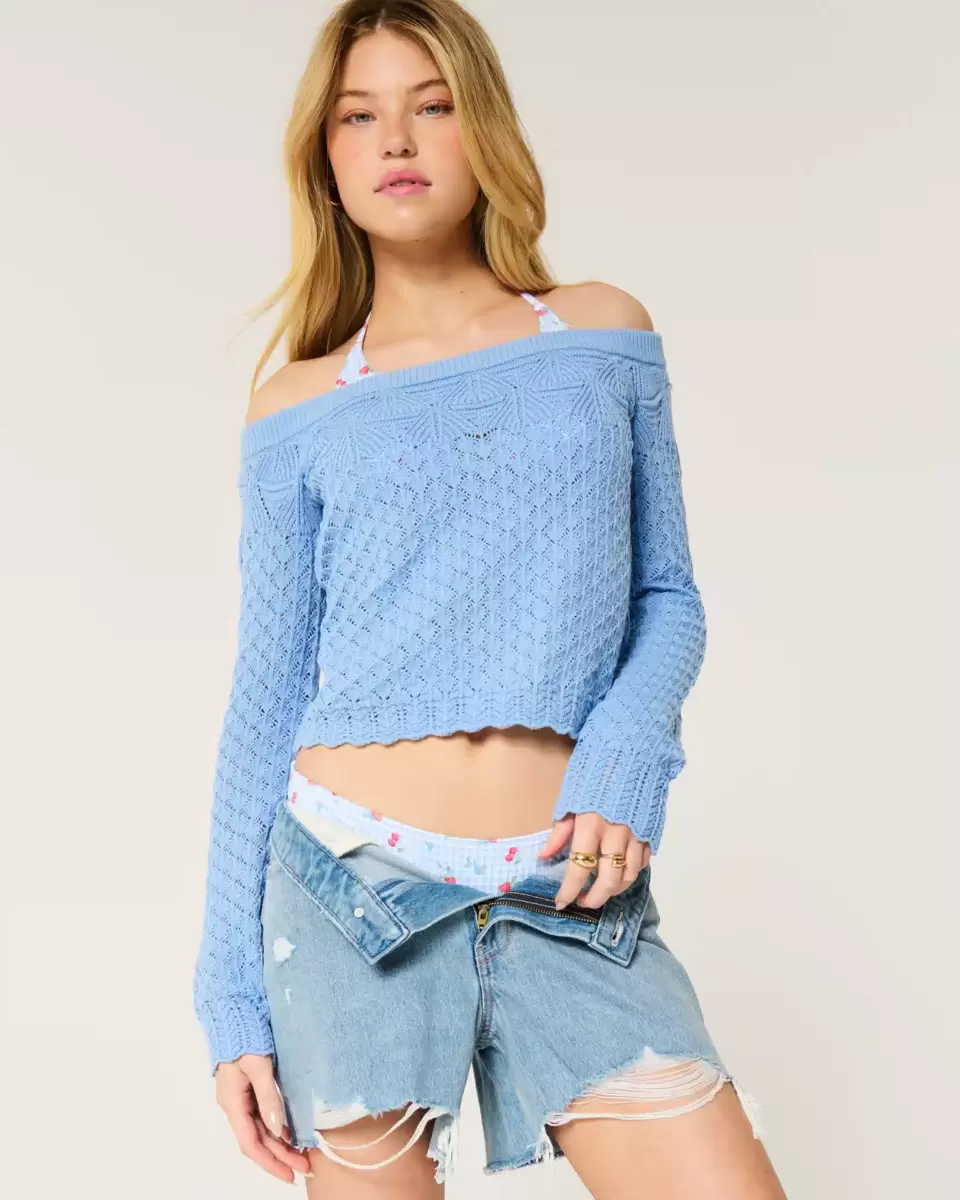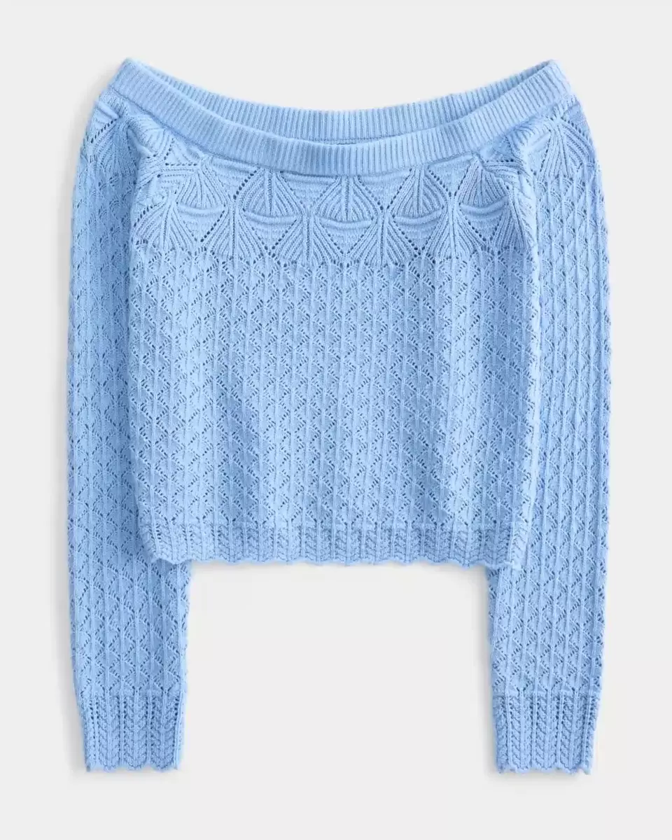 This super soft sweater is made with cozy crochet-style fabric with stitchy texture and features an off-the-shoulder neckline. Ribbed neckline, long sleeves. Slim Fit. Imported.