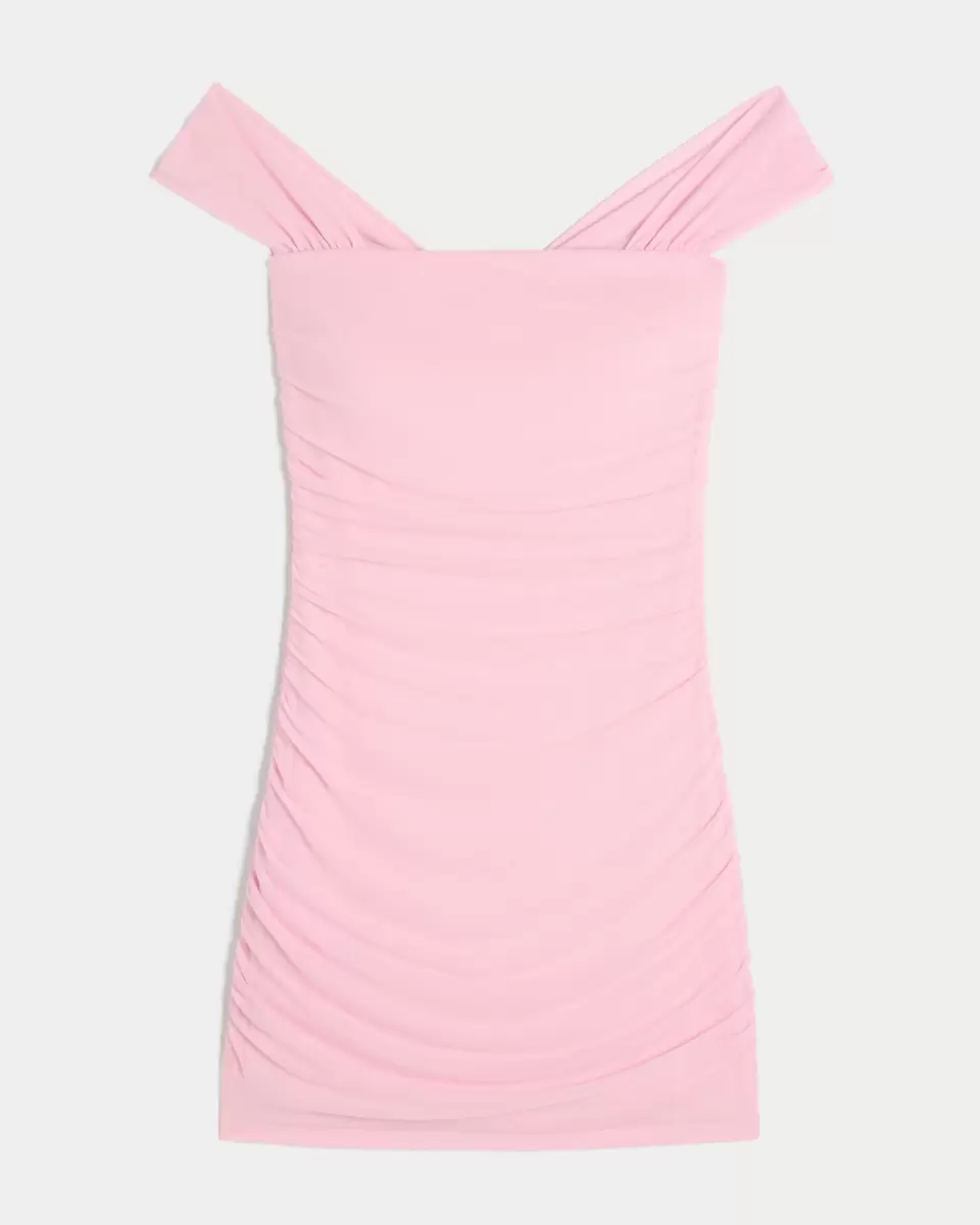 A pretty bodycon dress in soft mesh fabric, featuring cascading ruched detailing from top to bottom. Off-the-shoulder straps. Imported.