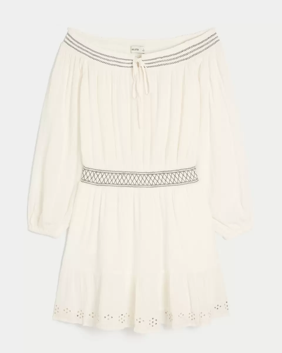 A flowy and super soft dress featuring a relaxed neckline that can be worn on or off the shoulder. Center tie detail at neckline, stitched details, eyelet embroidery at hem, long sleeves. Imported.