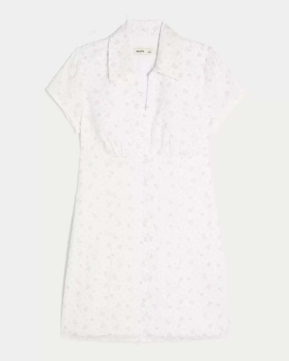 A cute shirt dress with center buttons and a collar. Short sleeves with scalloped lace trim. Imported.