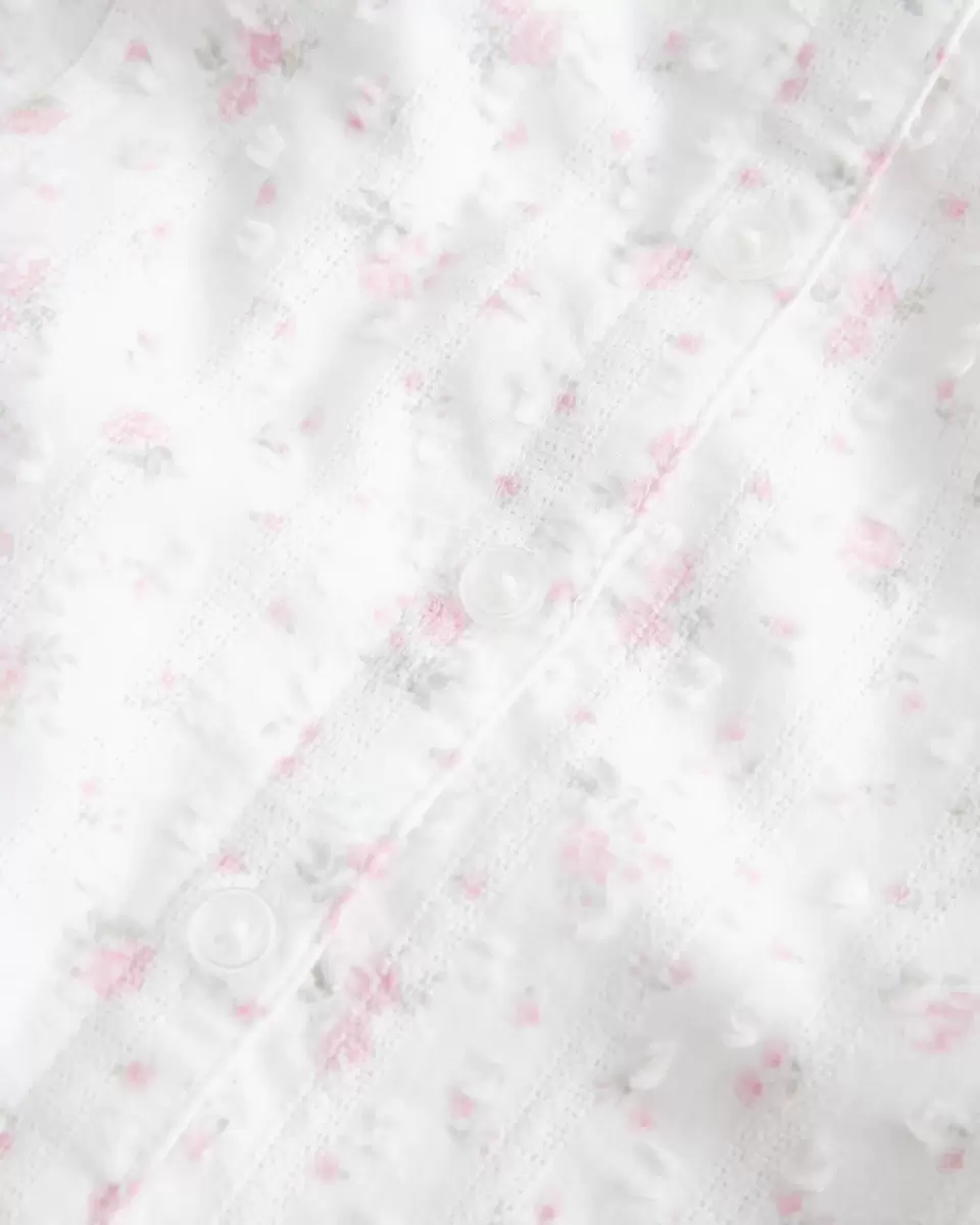 A cute shirt dress with center buttons and a collar. Short sleeves with scalloped lace trim.