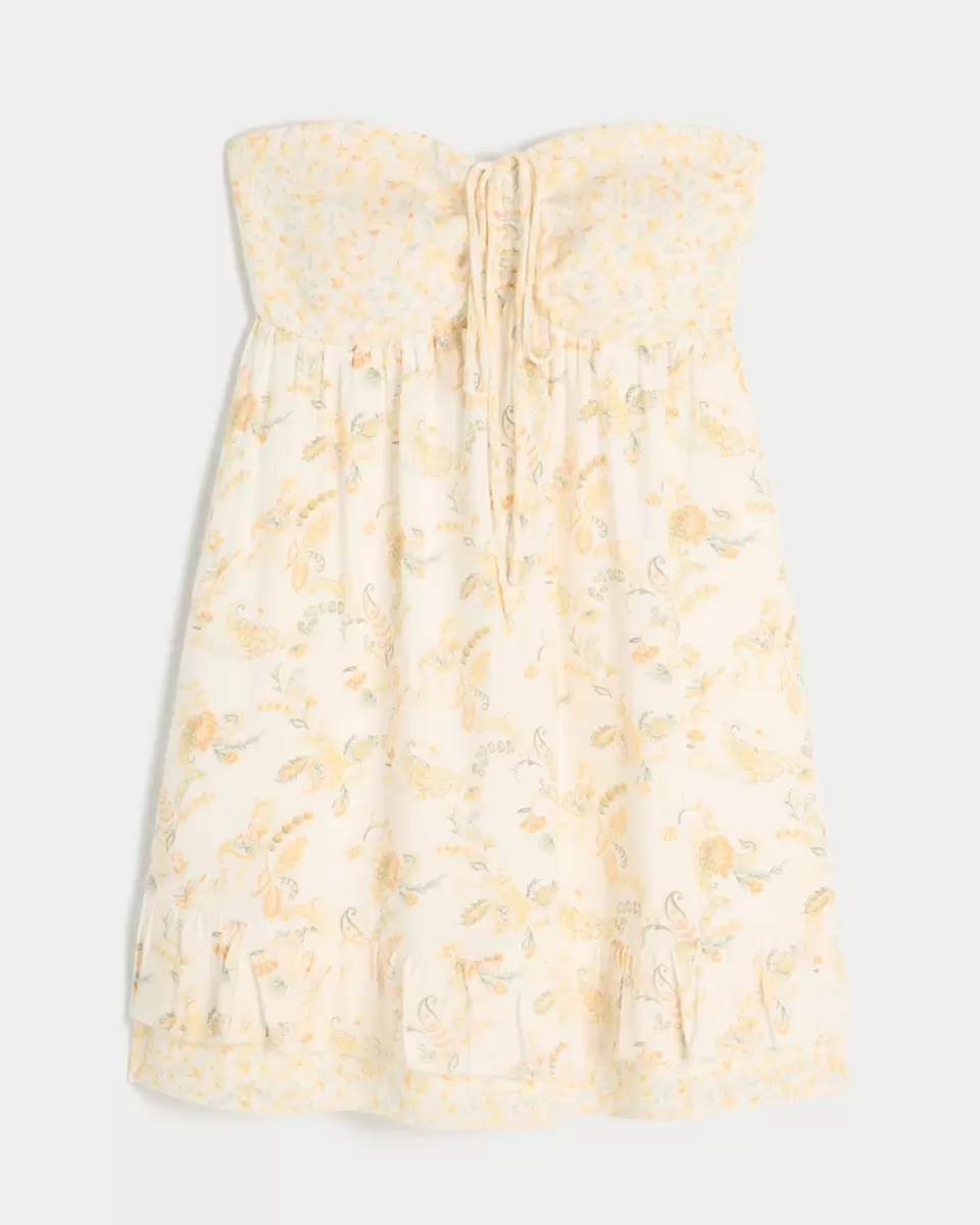 A flowy and super soft mini dress with a ruffled layered hem. Strapless, cinched with center tie at bust. Imported.