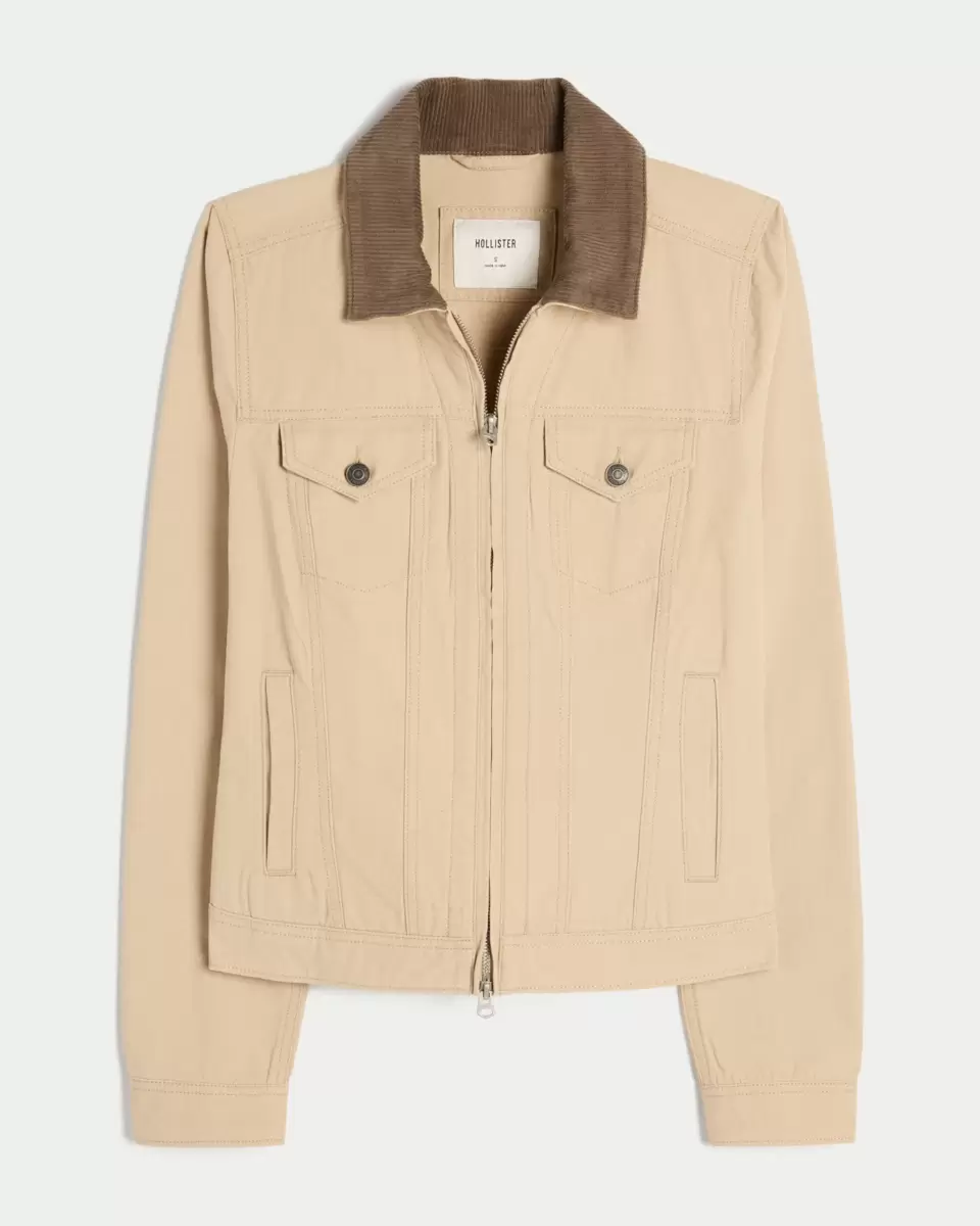 A classic Y2K-inspired twill jacket with a full zip-up closure. Chest pockets, front pockets, corduroy collar. Imported.