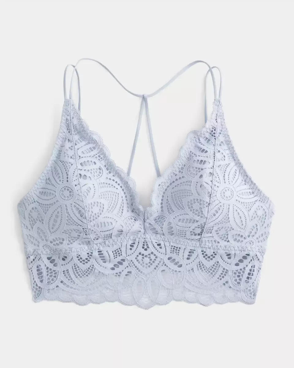 Cute and comfy, this bralette features all-over crochet-style lace detailing and a strappy back. Perfect for layering or wearing on its own! Imported.
