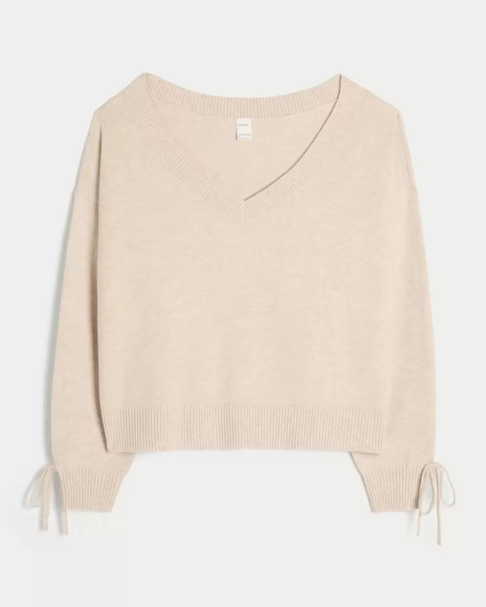 A cozy and super soft sweater with an off-the-shoulder v-neckline and cute bow details at the sleeves. Ribbed trims, long sleeves.