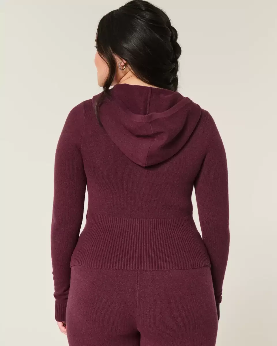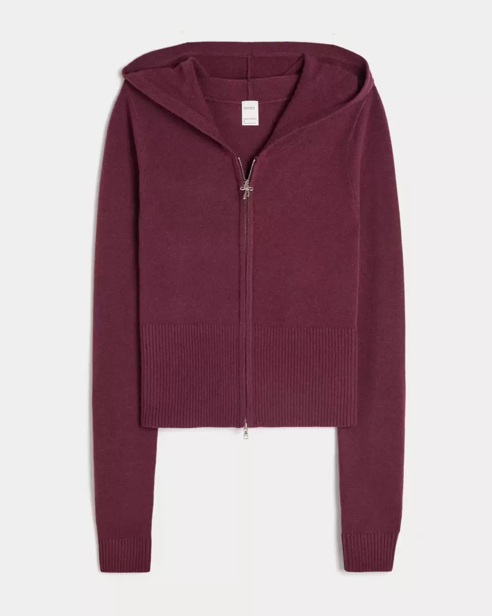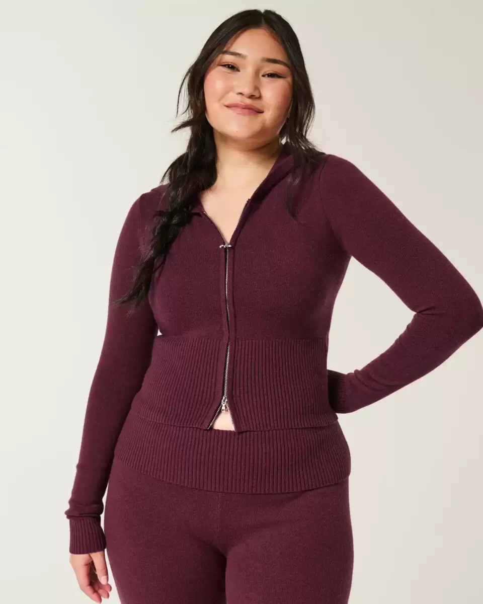 A cozy and super soft sweater hoodie with a dual zipper closure and long sleeves. Ribbed trims. Imported.