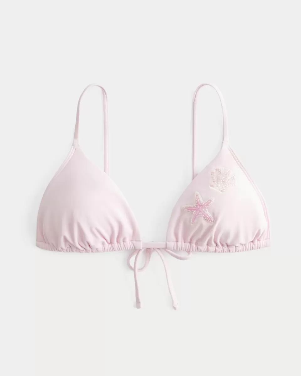 A cute bikini top in a triangle silhouette, featuring adjustable over-the-shoulder straps and embroidered patches with bead details. Tie closure, removable padding. Imported.