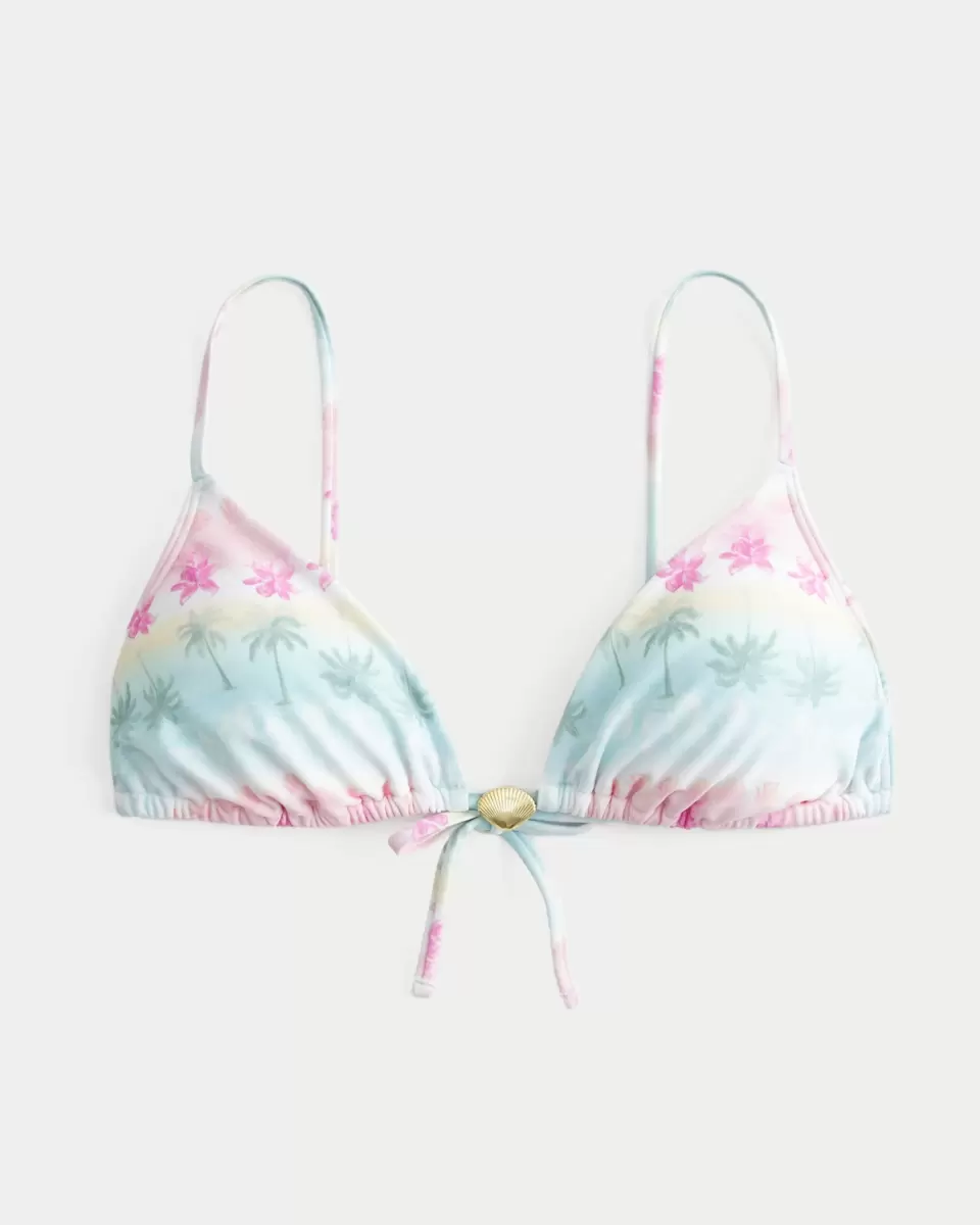A cute bikini top in a triangle silhouette, featuring adjustable over-the-shoulder straps and a metal charm detail. Tie closure, removable padding.