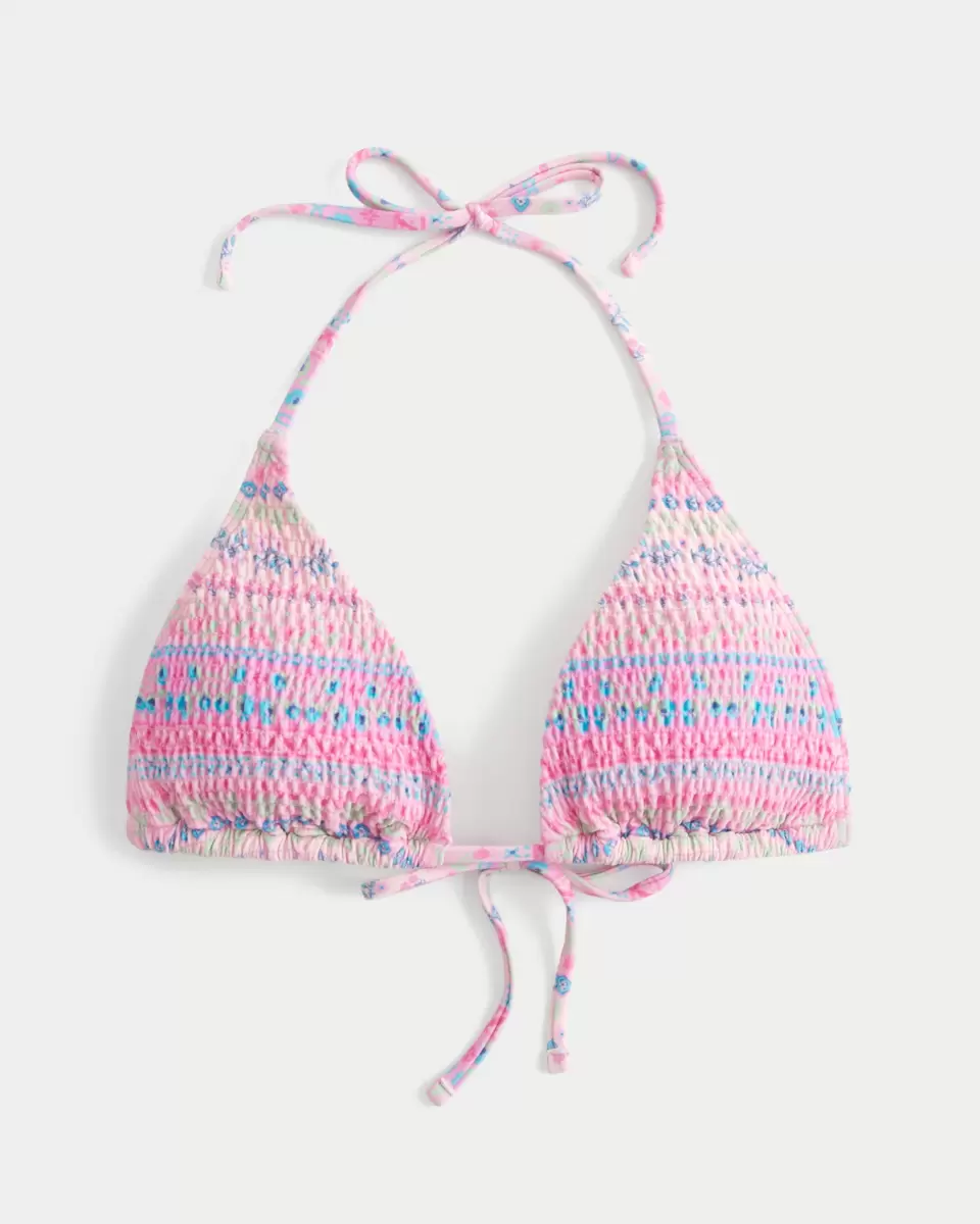 This cute bikini top is designed with straps and a triangle silhouette. Soft smocked swim fabric, tie closure, removable padding.