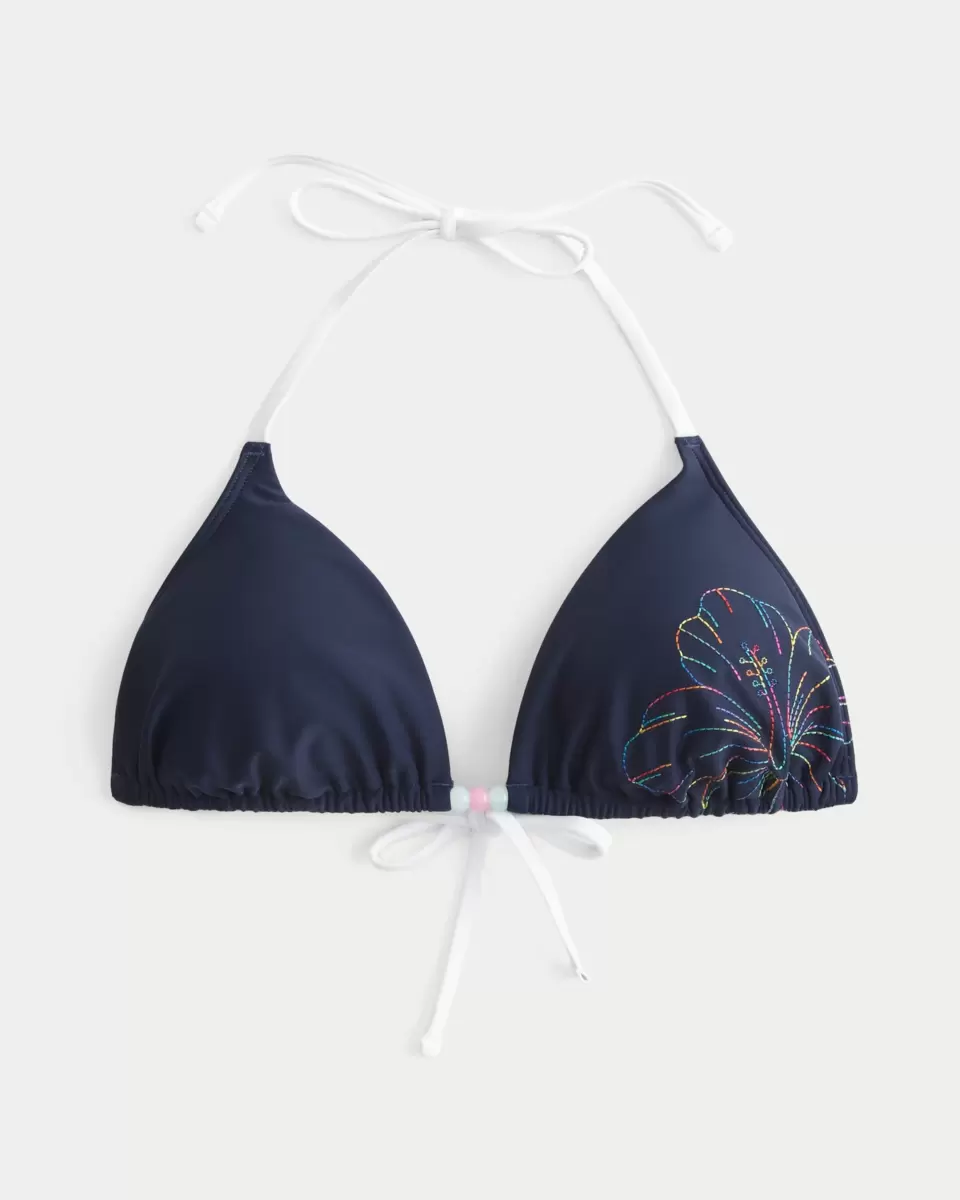 This cute triangle bikini top features bead details, a tie closure and an embroidered spring-break-inspired graphic. Soft swim fabric, removable padding.