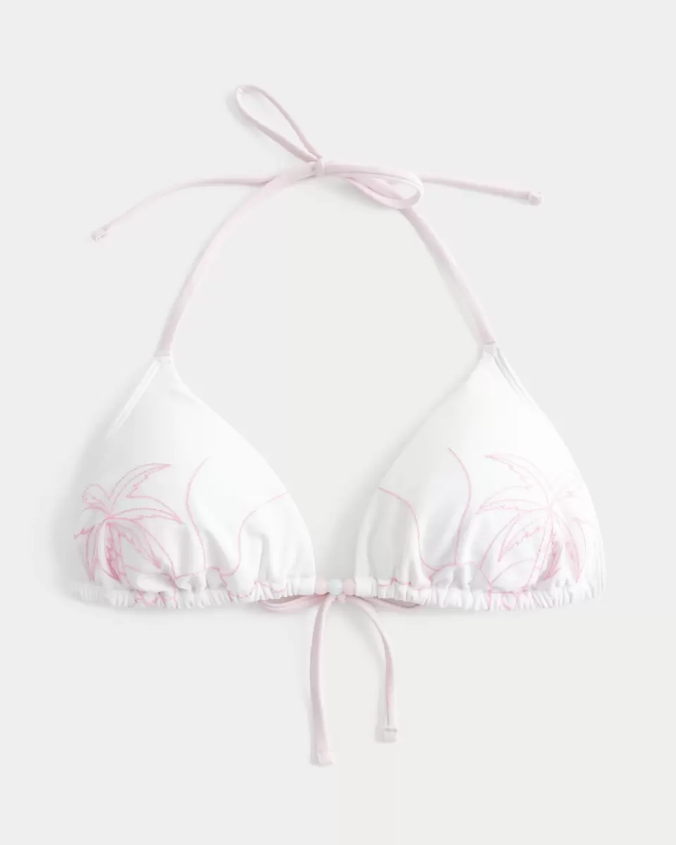 This cute triangle bikini top features bead details, a tie closure and an embroidered spring-break-inspired graphic. Soft swim fabric, removable padding.