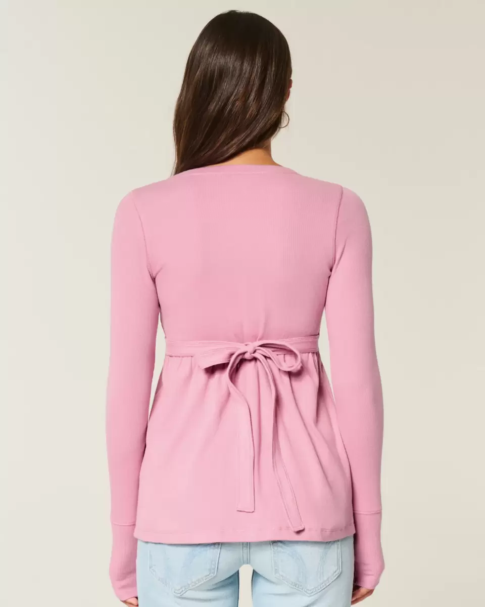 Cute and super soft, this babydoll top features a henley-style button placket and back tie. Long sleeves.