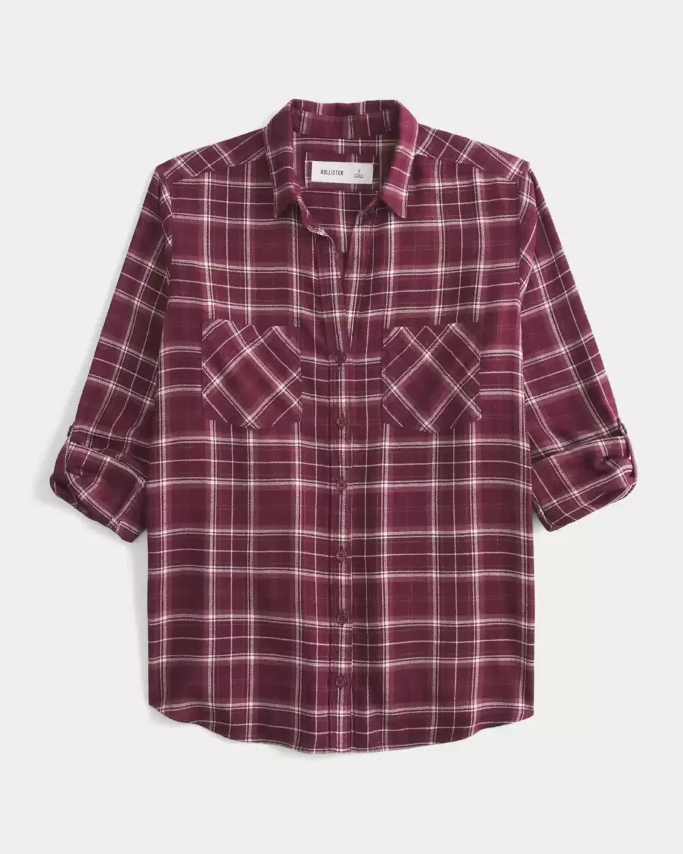 A super soft flannel shirt with a full button closure, chest pockets and button-up sleeve tabs. Collar. Oversized Fit. Imported.