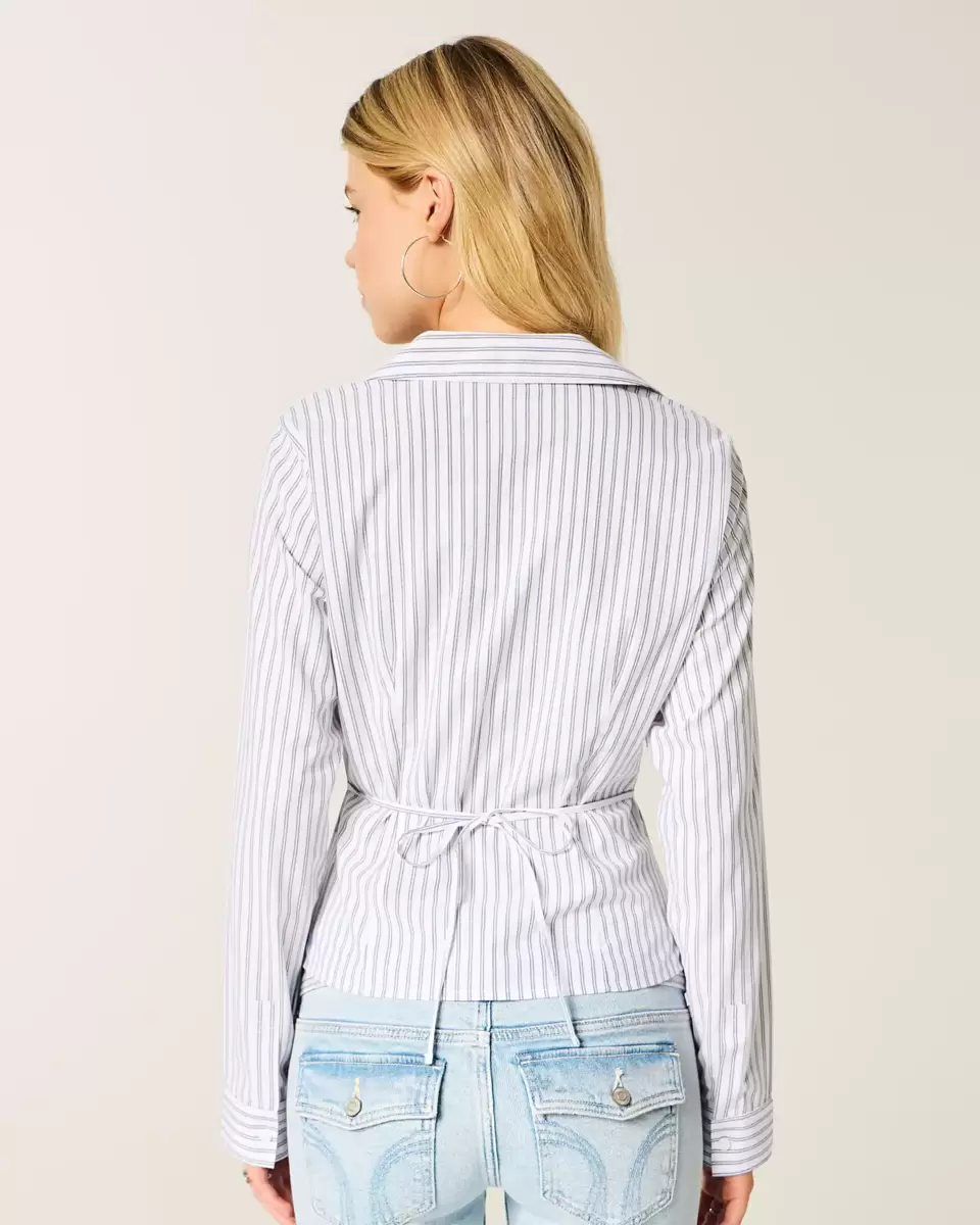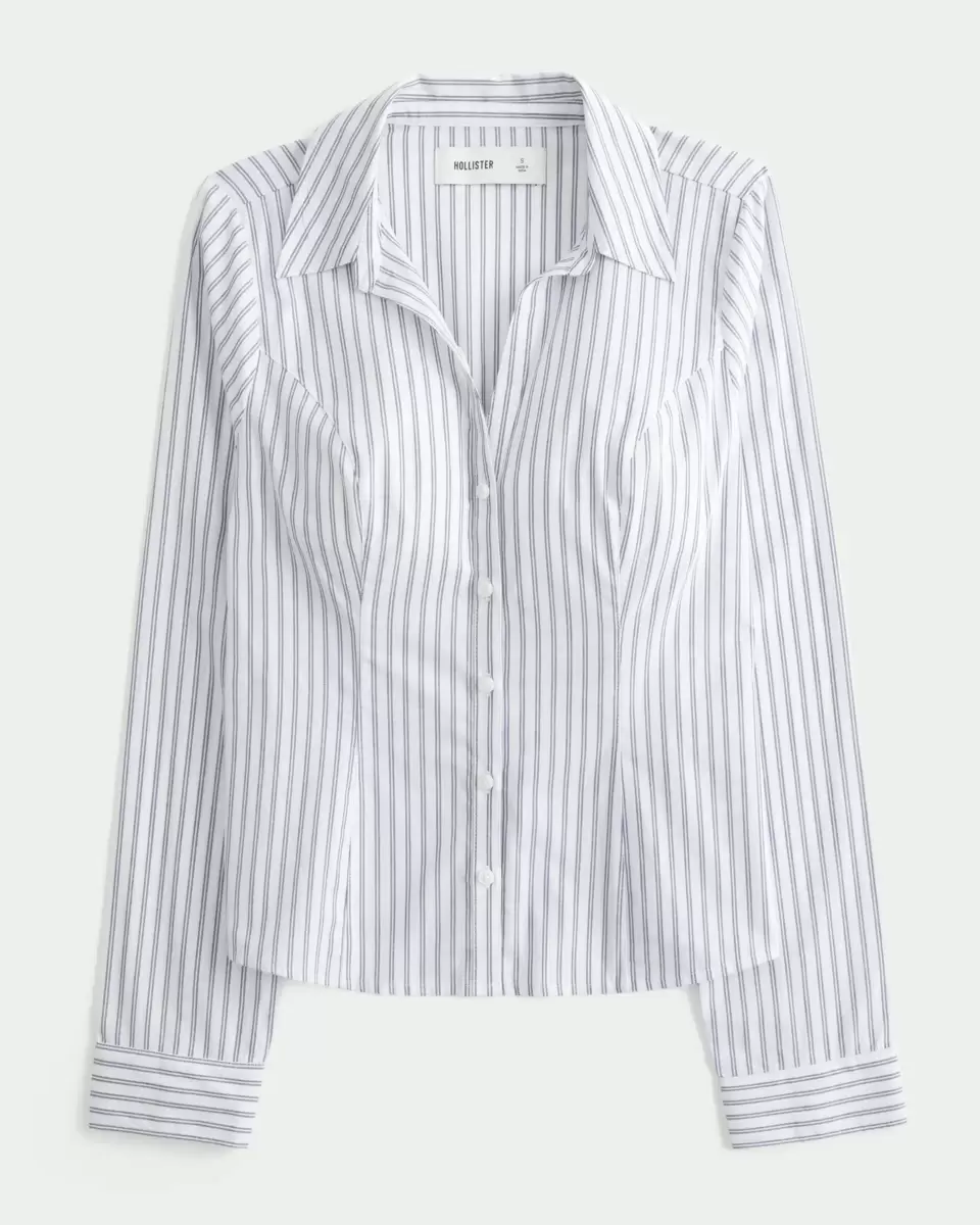 A Y2K-inspired, slim-fitting long-sleeve stretch poplin shirt with a collar, seaming, and adjustable back tie. Full button closure. Slim Fit. Imported.
