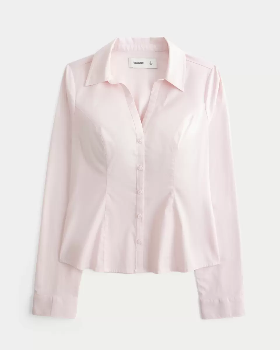 A Y2K-inspired, slim-fitting long-sleeve stretch poplin shirt with a collar, seaming, and adjustable back tie. Full button closure. Slim Fit.