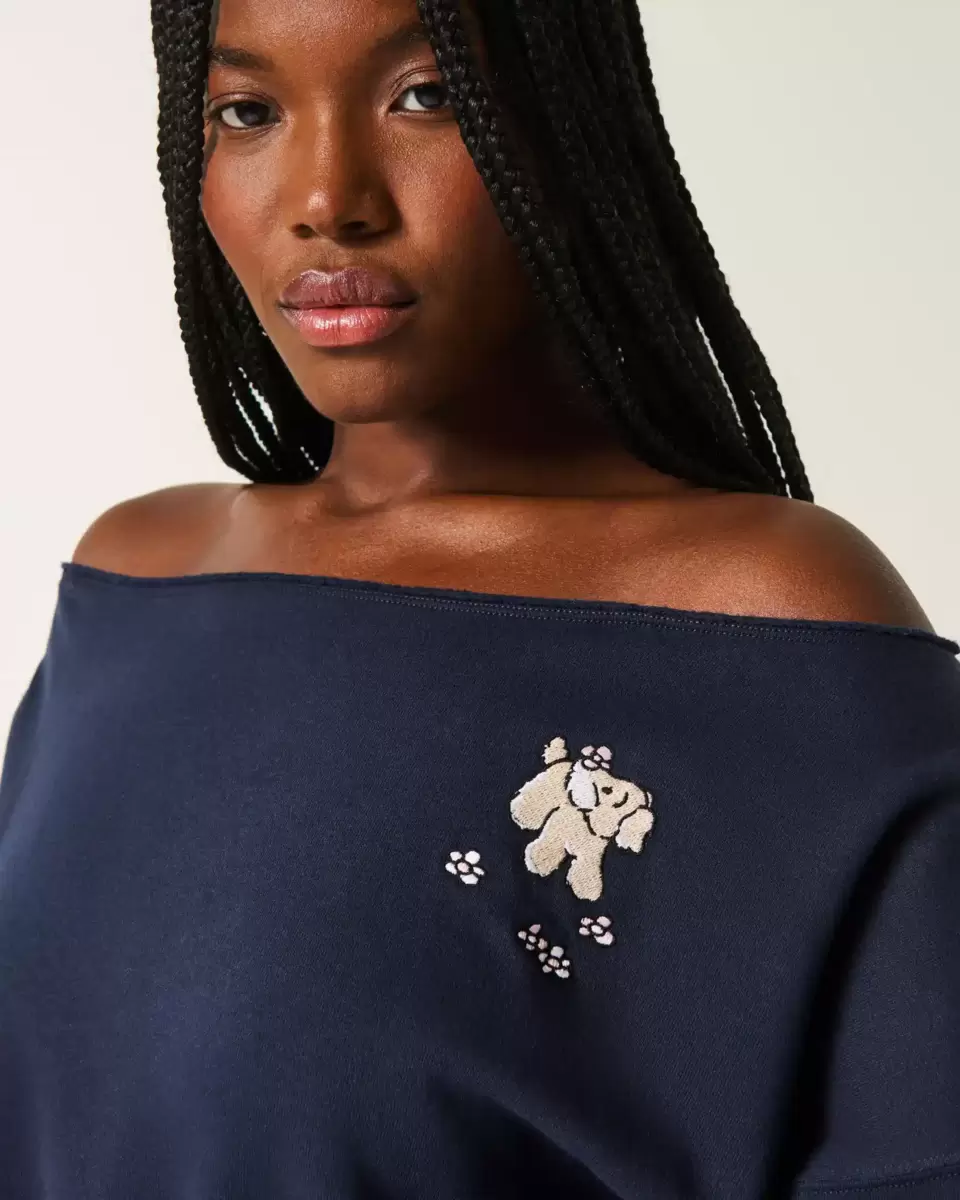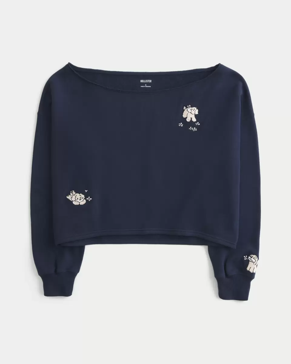 This super soft fleece sweatshirt has a relaxed neckline that can be worn off both shoulders. Long sleeves, cute dog graphic embroidery. Easy Fit. Imported.