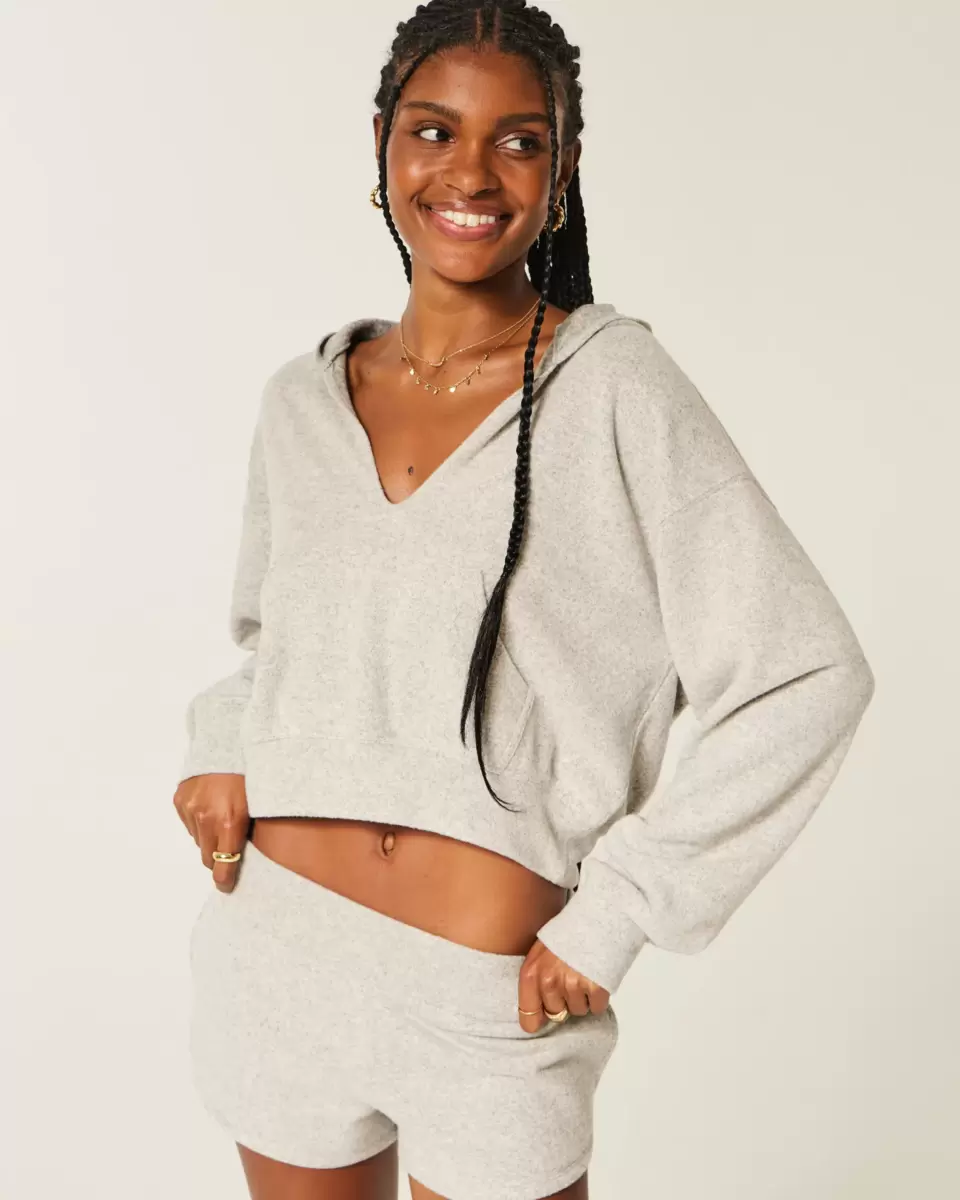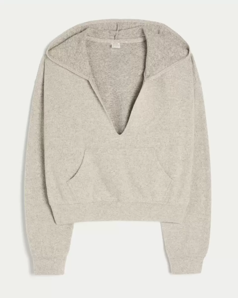 A super soft knit hoodie with a front pouch pocket and deep v-neckline. Hood, long sleeves.