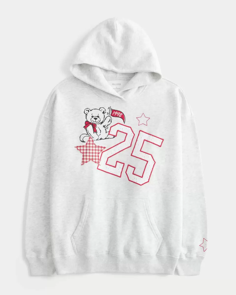 A super soft fleece hoodie featuring varsity-style number graphic applique with eyelet details and embroidery. Front pouch pocket, hood, long sleeves. Oversized Fit.