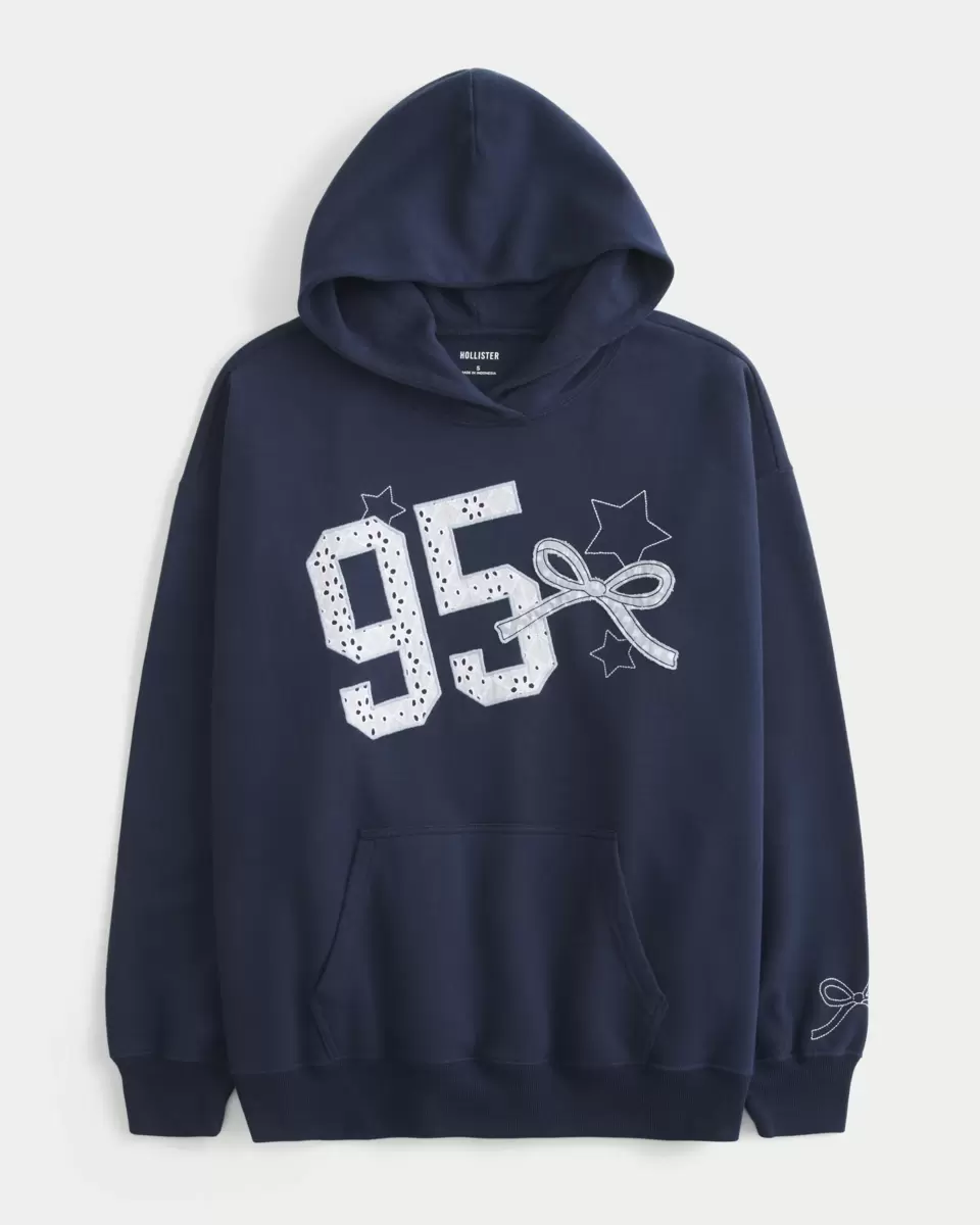 A super soft fleece hoodie featuring varsity-style number graphic applique with eyelet details and embroidery. Front pouch pocket, hood, long sleeves. Oversized Fit.