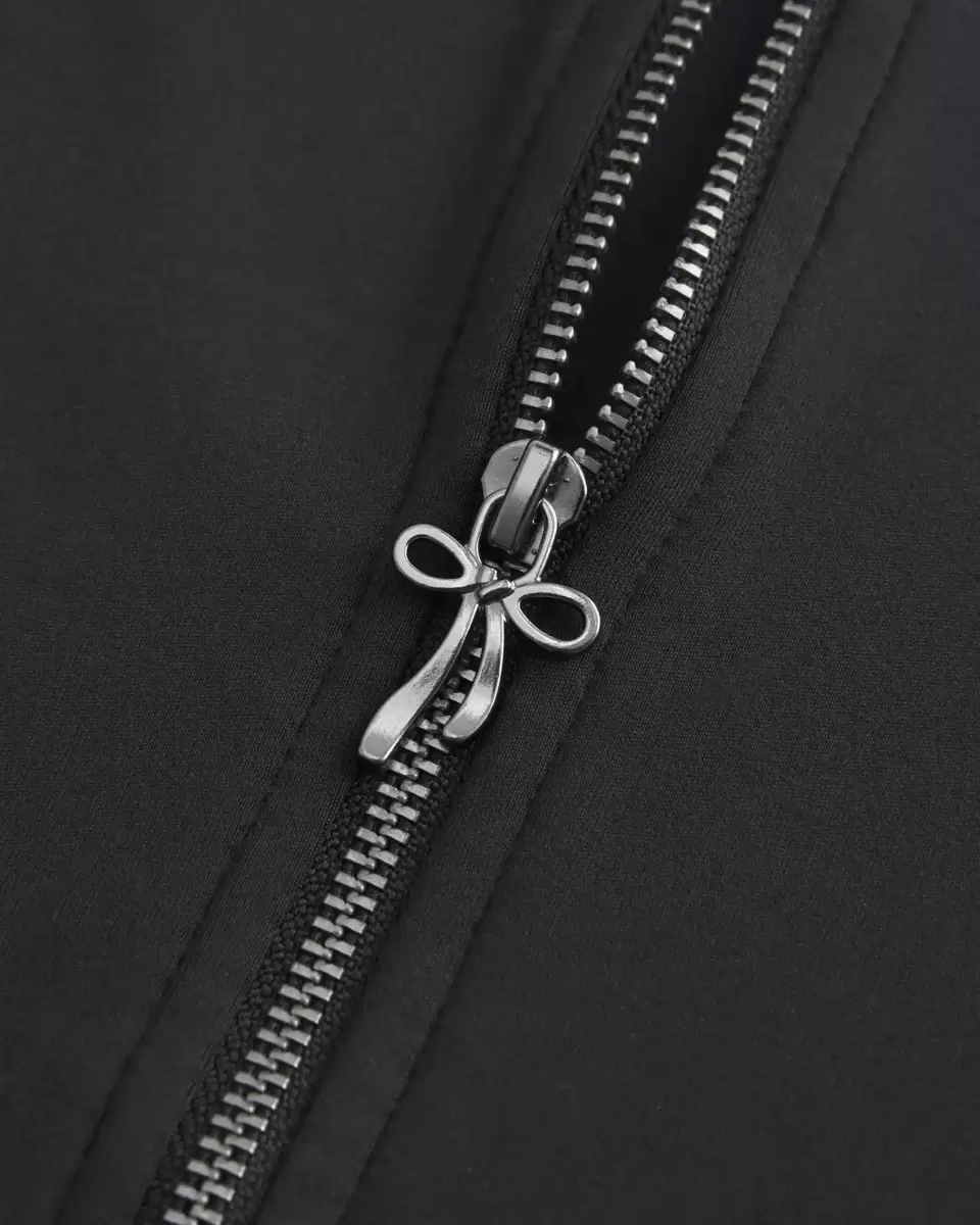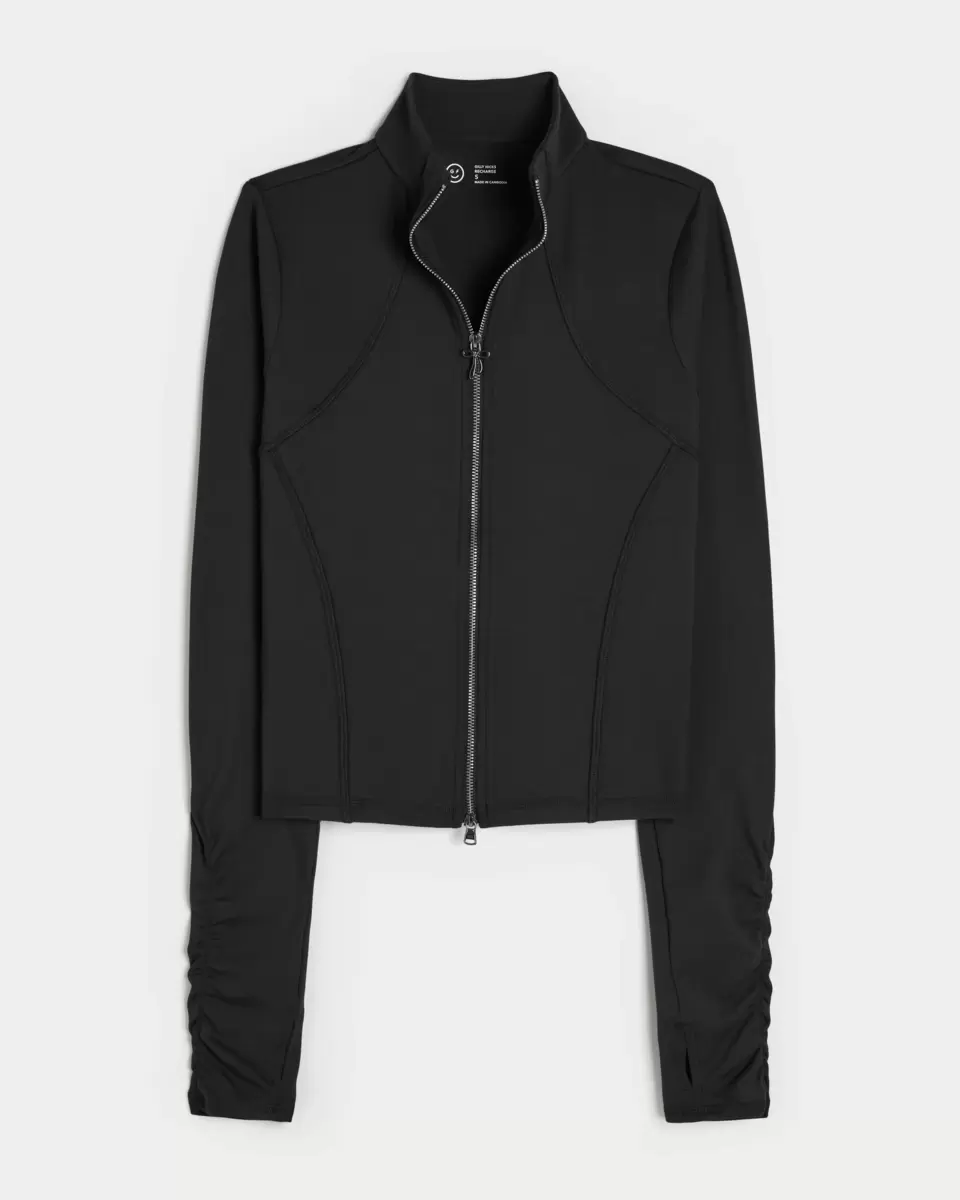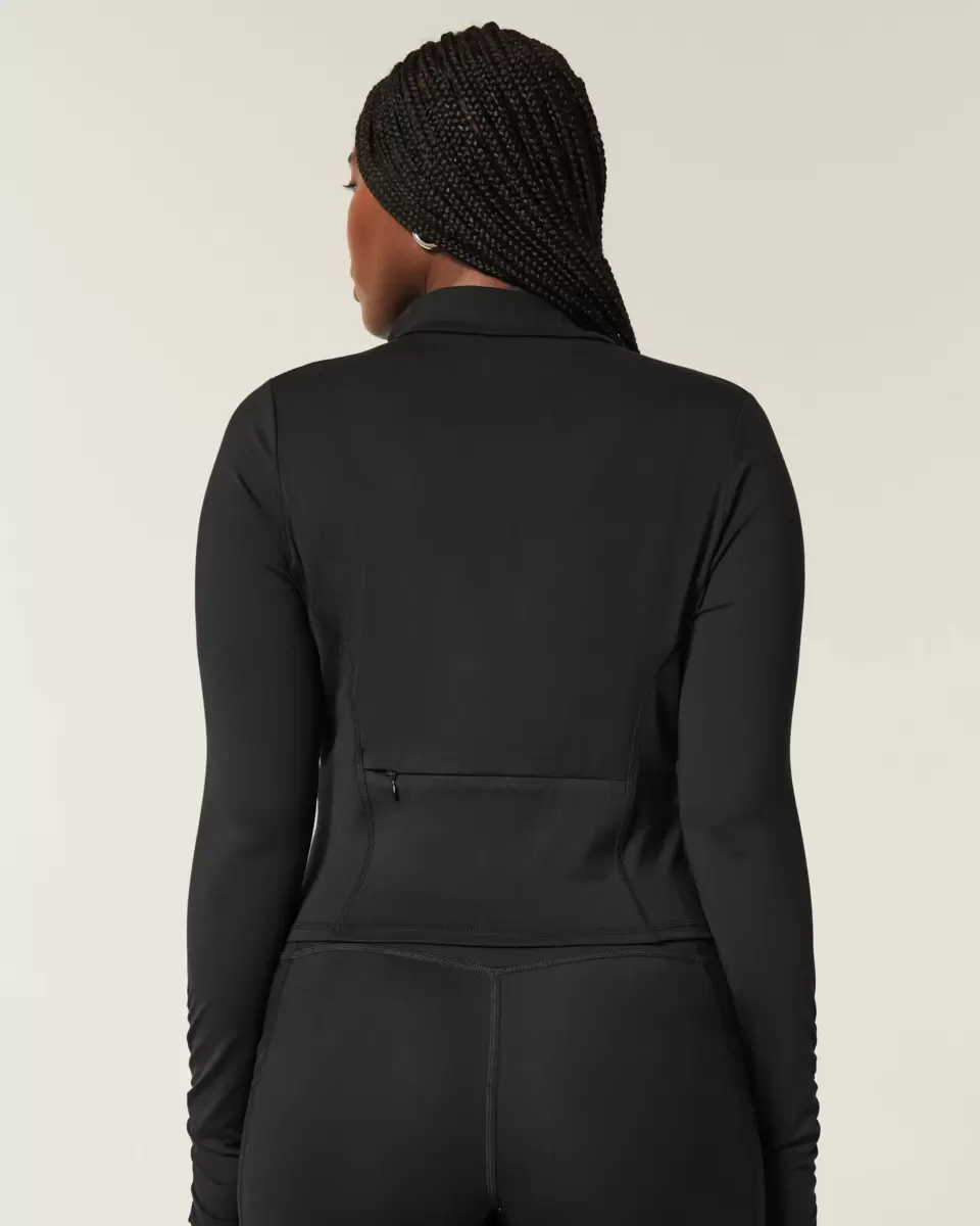 Designed in our breathable, 4-way stretch, moisture-wicking Recharge fabric with a super soft, brushed feel. Double zipper closure with bow detail, front pockets, long sleeves with ruched details and thumb openings. Imported.
