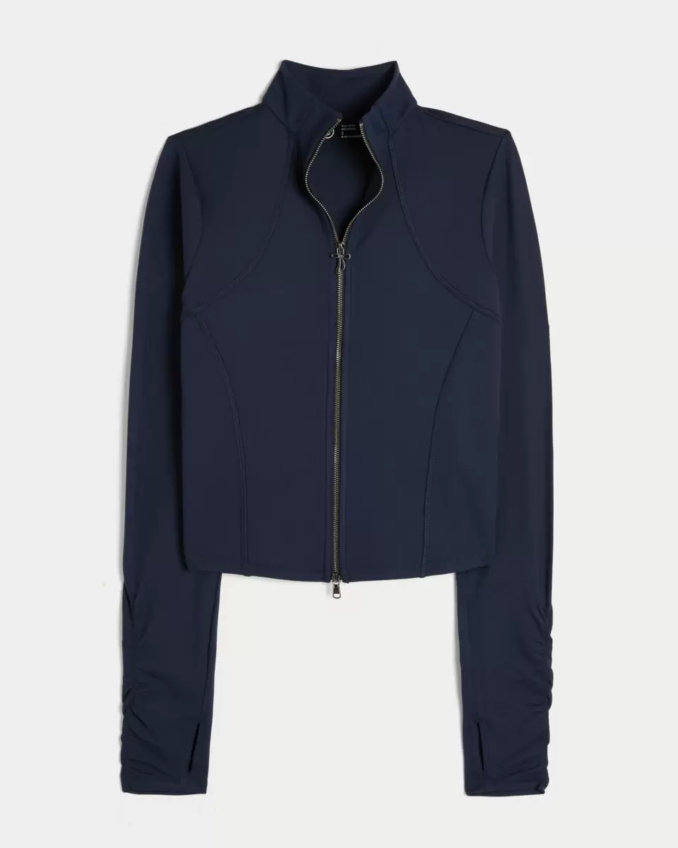 Designed in our breathable, 4-way stretch, moisture-wicking Recharge fabric with a super soft, brushed feel. Double zipper closure with bow detail, front pockets, long sleeves with ruched details and thumb openings. Imported.