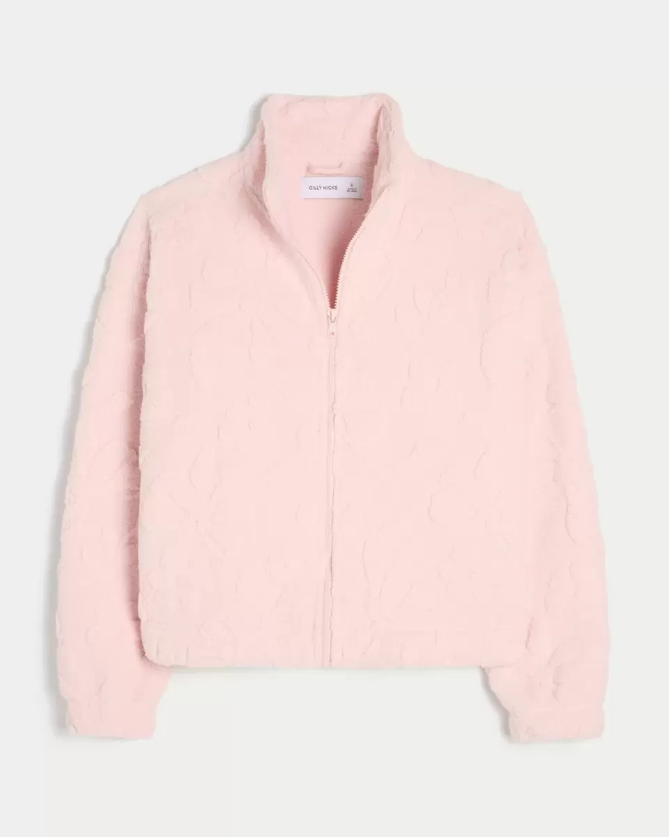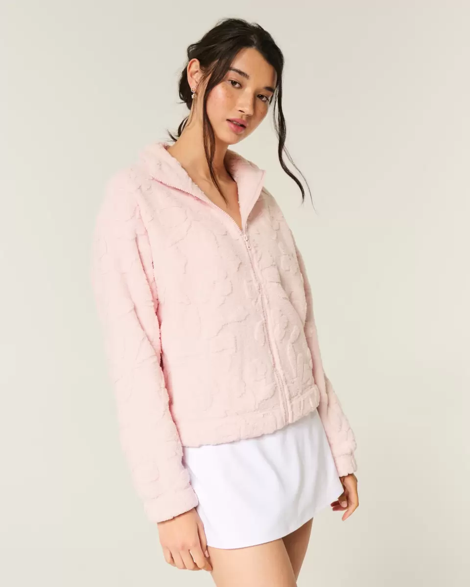 A cozy and super soft top in sherpa fabric featuring all-over patterns. Full zip-up closure, mock-neck collar.