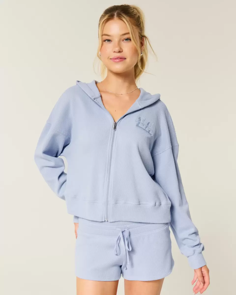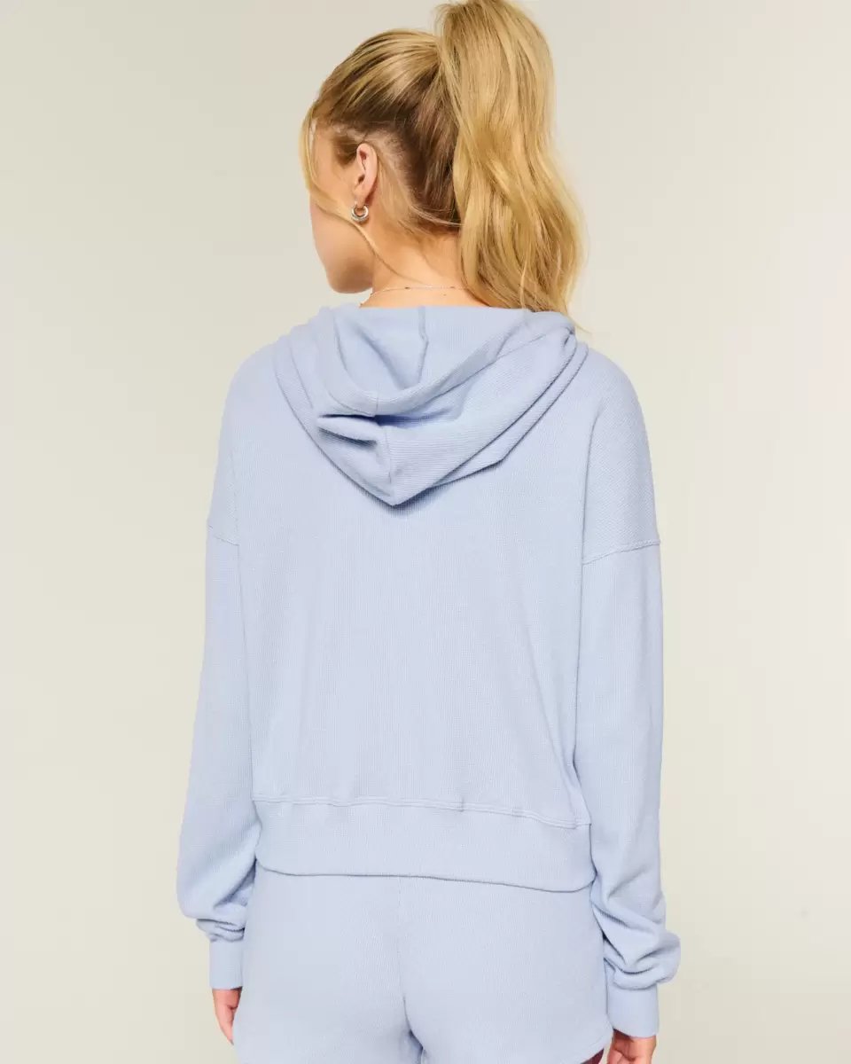 A super soft hoodie in cozy waffle fabric, with a full zip-up closure. Long sleeves, hood. Imported.