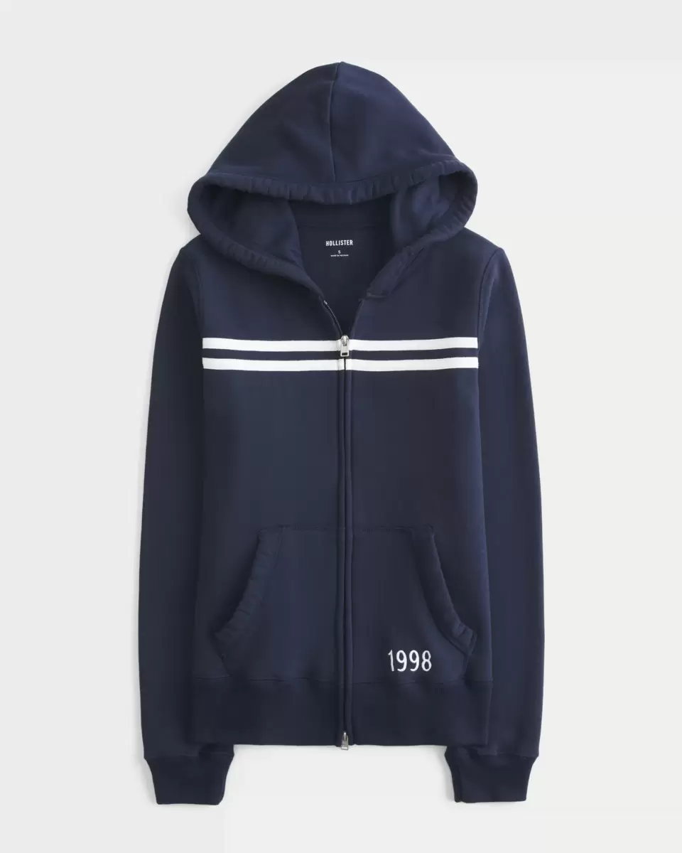 A super soft fleece hoodie featuring chest stripes and 1998 graphic embroidery at the pocket. Full zip-up closure, long sleeves, front pockets, hood. Slim Fit. Imported.