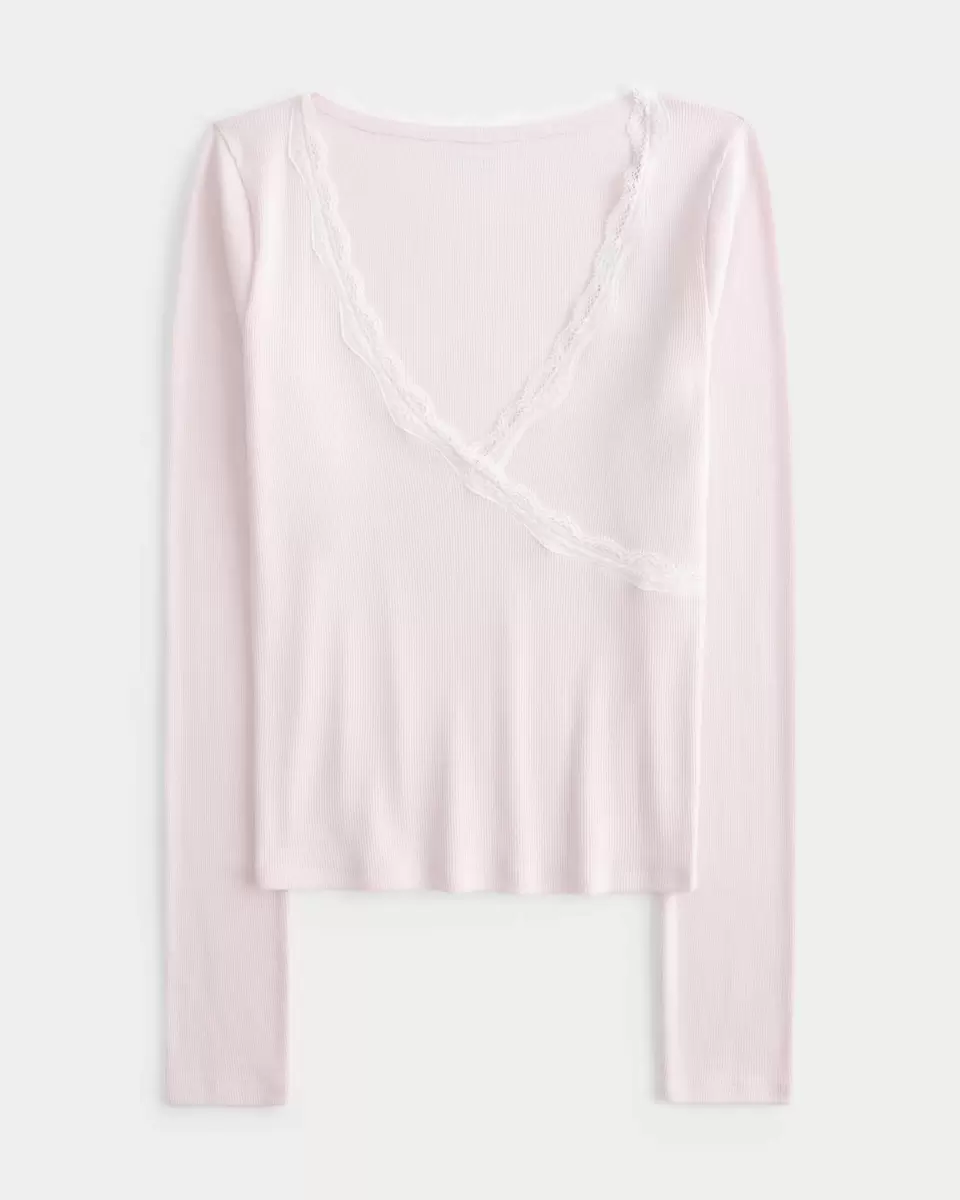 A super soft long-sleeve top featuring a wrap-style v-neckline with pretty lace trim. Slim Fit.