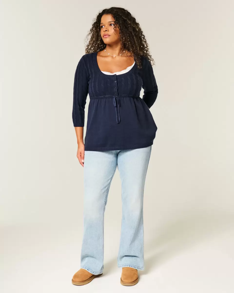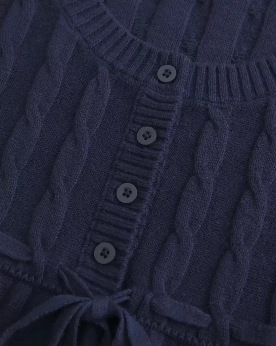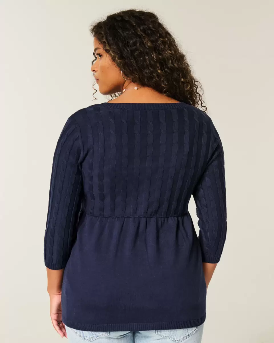 This cozy and super soft sweater is designed with a pretty babydoll silhouette. Interwoven waist tie detail, ribbed trims, long sleeves, cable-knit patterns, center button details. Imported.
