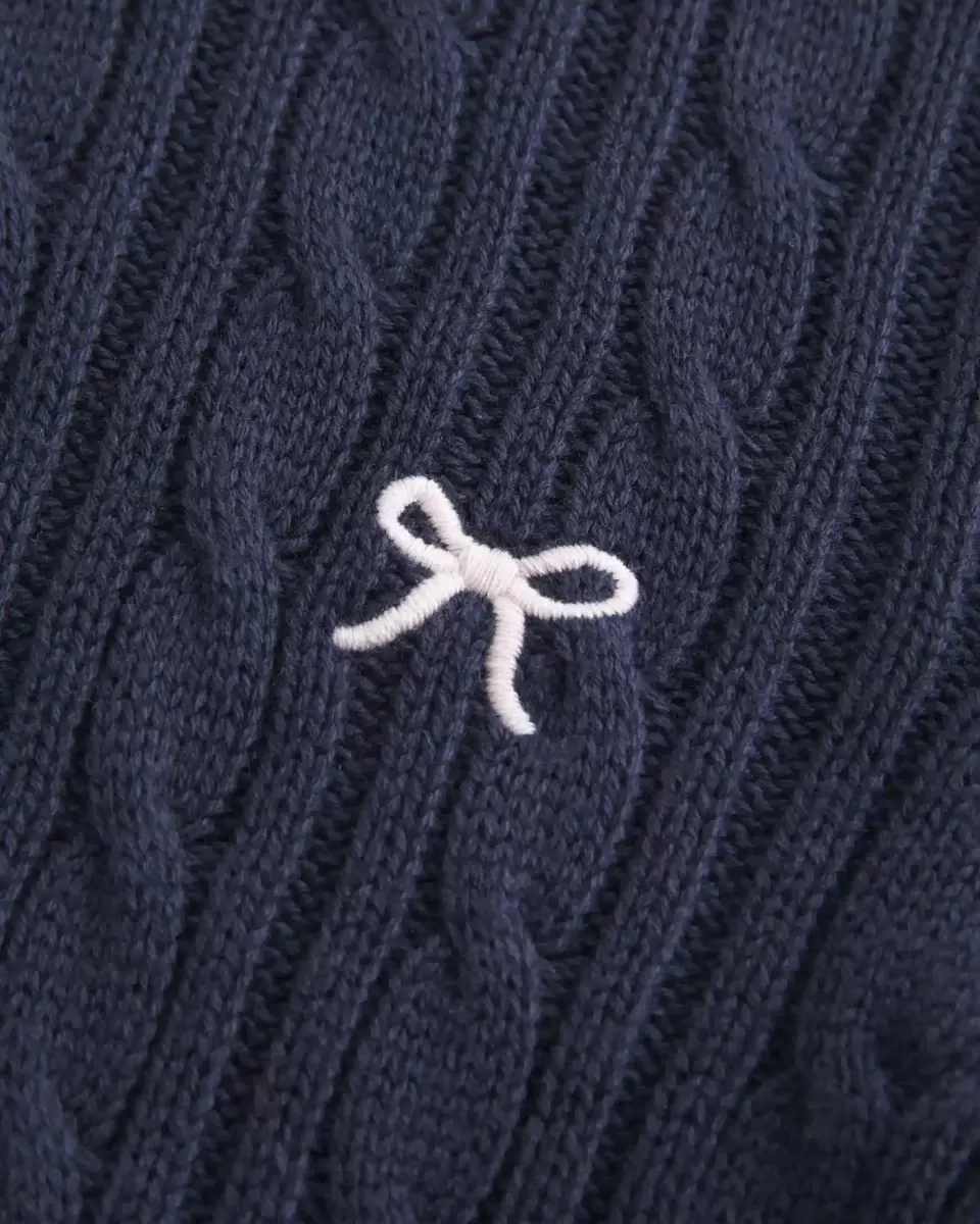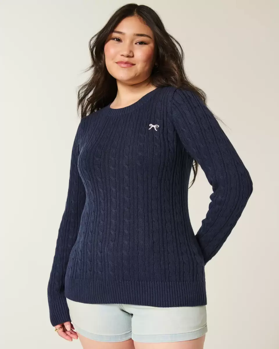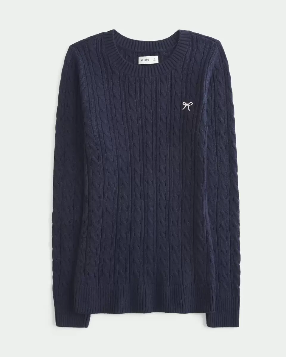 A cozy and super soft cable-knit sweater with an embroidered left chest bow graphic. Crew neckline, longer length, ribbed trims. Slim Fit. Imported.
